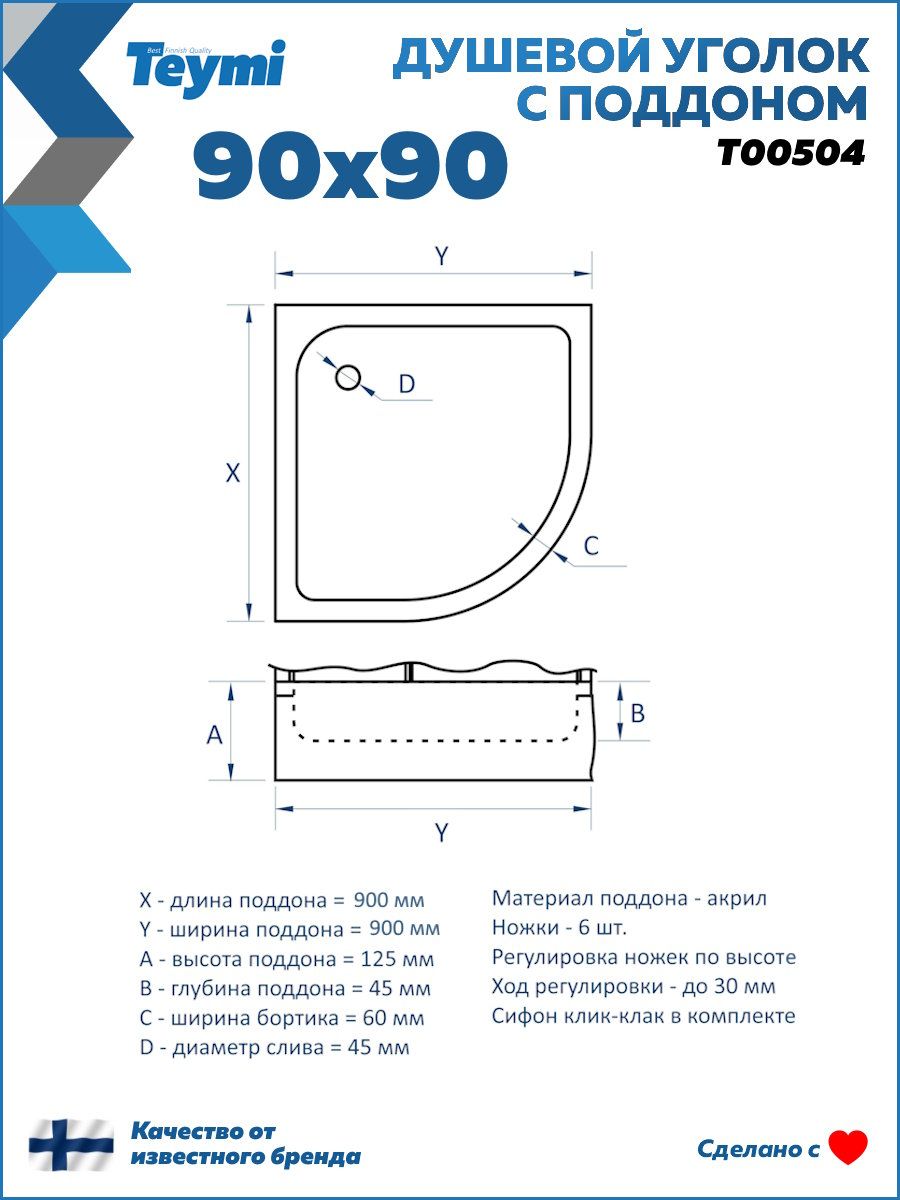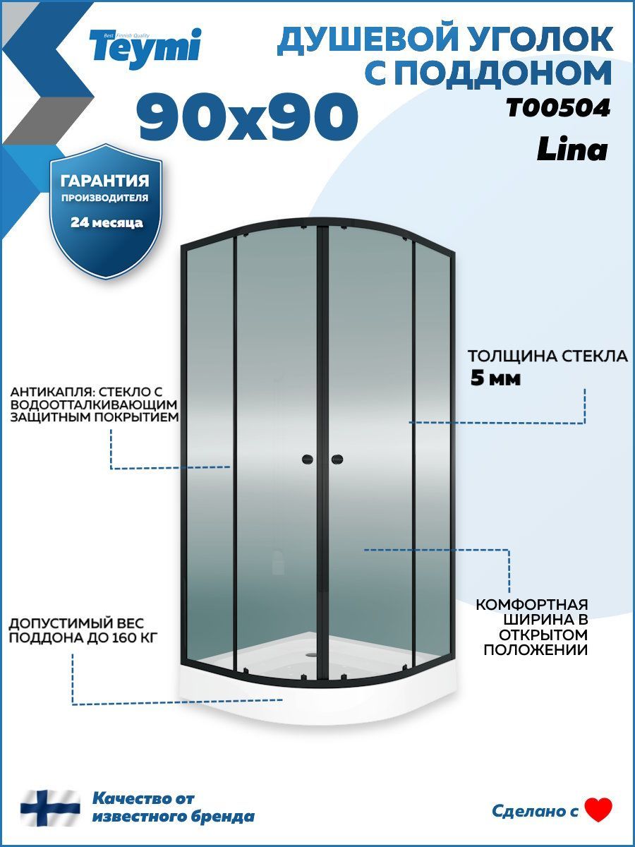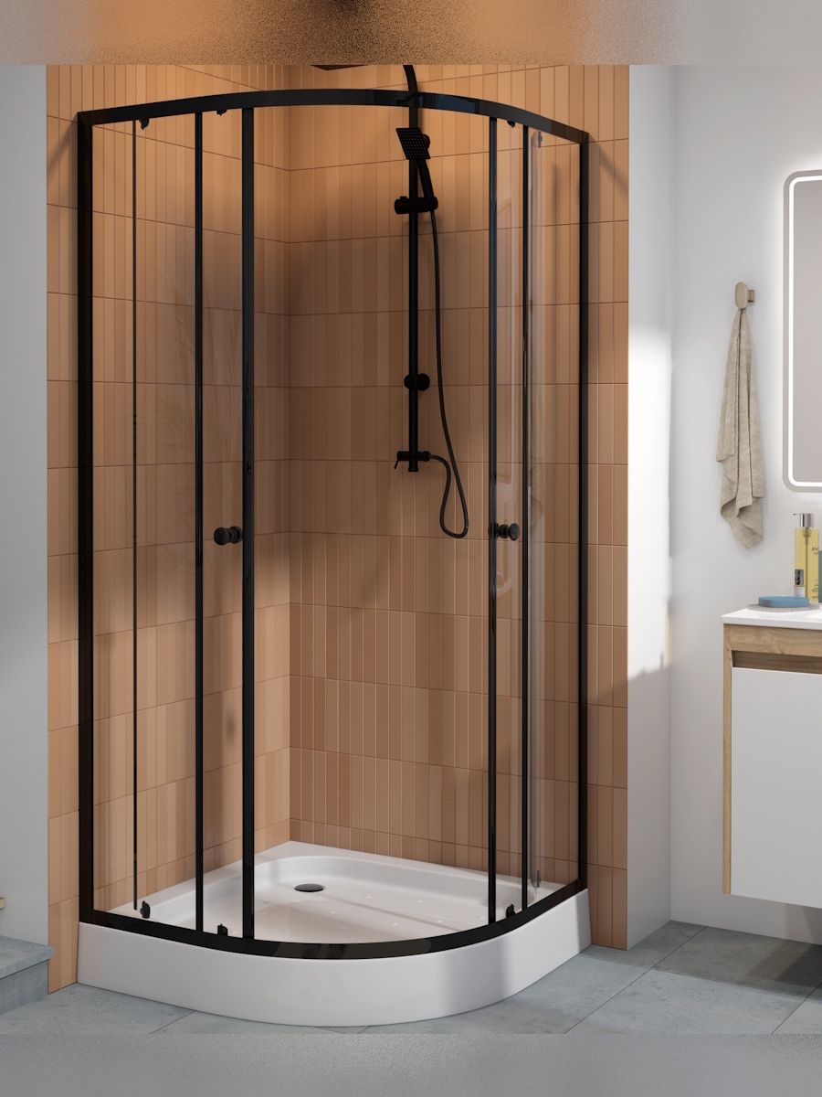 Душевой уголок 90х90 с поддоном Teymi Lina T00504 — современное решение для тех, кто ценит стиль, удобство и эргономичное использование пространства. Конструкция с универсальной ориентацией идеально подходит для установки в угол ванной комнаты, позволяя максимально эффективно задействовать площадь. Прозрачные закалённые стеклянные панели толщиной 5 мм придают интерьеру лёгкость и визуально расширяют помещение. Особое внимание уделено дизайну: матовый чёрный алюминиевый профиль подчёркивает современный характер интерьера, создавая выразительный контраст и подчёркивая детали отделки. Раздвижные двери на роликах открываются плавно и бесшумно, обеспечивая удобный доступ внутрь. Поддон из акрила высотой 125 мм укомплектован шестью регулируемыми ножками, что позволяет точно настроить уровень на любом типе пола. Антискользящее покрытие повышает безопасность при использовании, а регулировка устойчивости до 30 мм обеспечивает адаптацию даже к неровным поверхностям. Комплект поставки включает сифон клик-клак для простого и надёжного слива. Антиизвестковое покрытие облегчает уход за стеклянными поверхностями, предотвращая образование налёта и сохраняя безупречный внешний вид. Ключевые особенности: ·         Прозрачное закалённое стекло 5 мм для надёжности и визуальной лёгкости ·         Чёрный матовый алюминиевый профиль для стильного акцента ·         Раздвижные двери на качественных роликах для комфорта при открывании ·         Низкий акриловый поддон с антискользящей поверхностью и шестью регулируемыми опорами ·         Универсальная ориентация для гибкой установки ·         Антиизвестковое покрытие для лёгкой очистки и долговечного блеска Комплектация: профили, акриловый поддон, сифон клик-клак, стеклянные дверные и глухие секции, силиконовый уплотнитель, ролики, крепёж, инструкция.