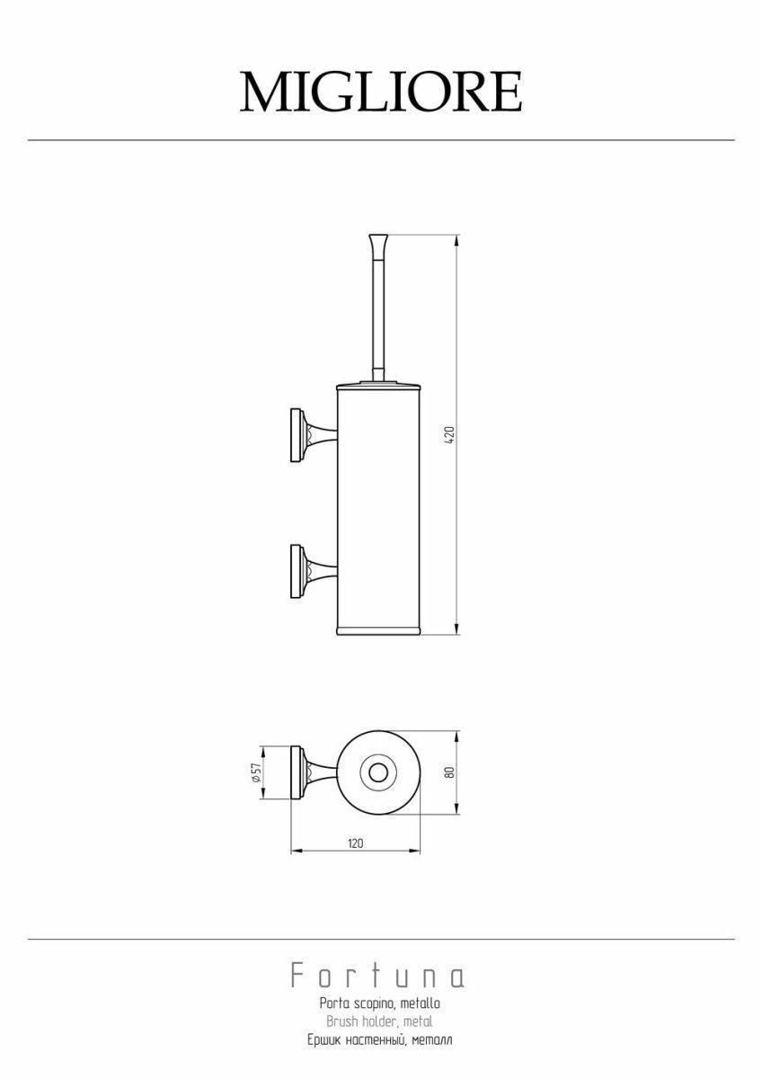 Настенный ершик серии FORTUNA бренда MIGLIORE   - это функциональный аксессуар для ванной комнаты. Внутри латунной колбы вставлена пластиковая колба, которую можно вынуть, чтобы помыть. Ерш вешается на стену и не мешает при уборке пола. Изделие выполнено из латуни и имеет высококачественное хромо-никелиевое покрытие, которое при правильном уходе надолго сохранит  свой блеск. Рекомендуется использовать чистящее средство бренда MIGLIORE для смесителей и аксессуаров с хромированным покрытием.