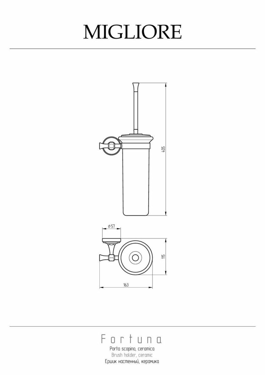 Настенный ершик серии FORTUNA бренда MIGLIORE   - это функциональный аксессуар для ванной комнаты. Керамическая колба выглядит эстетично и легко моется, и размещенный на стене ерш не мешает при уборке пола. Материал — латунь, покрытие цвета бронза. Внимание: бронзовое покрытие достаточно деликатное и для ухода рекомендуется протирать изделие мягкой безворсовой тряпочкой с мыльным раствором и вытирать насухо или использовать чистящее средство бренда MIGLIORE для смесителей и аксессуаров с деликатными покрытиями бронза, золото, медь.