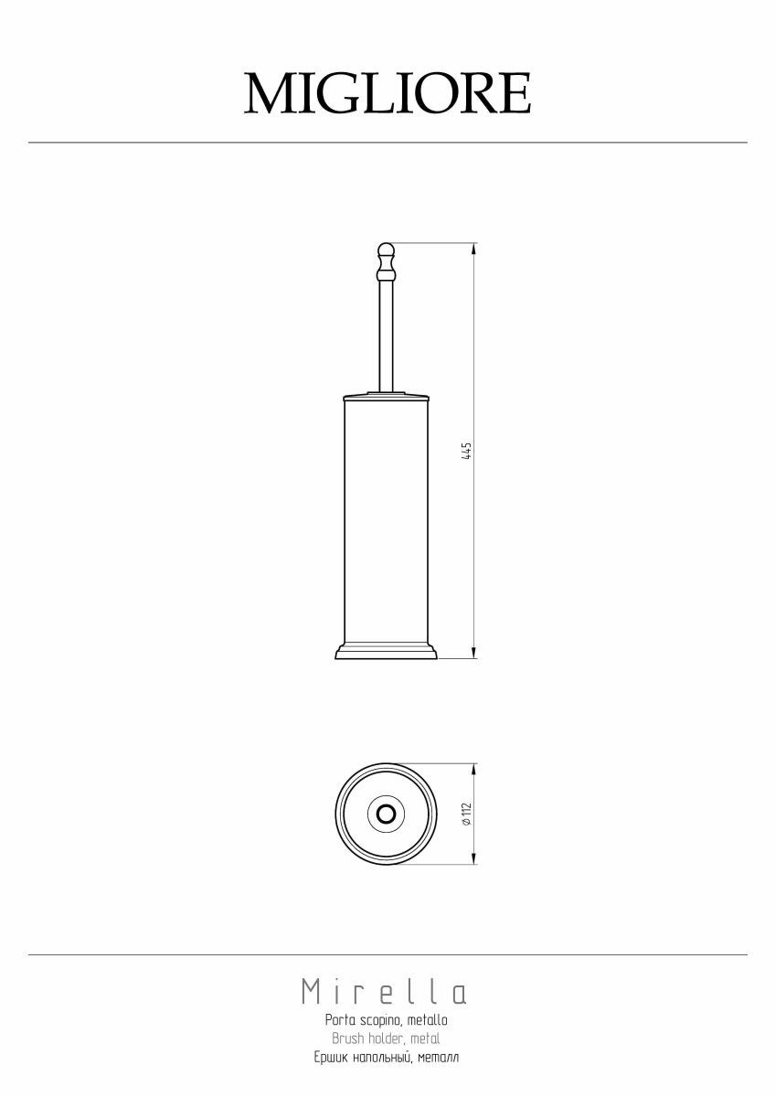 Напольный ершик серии MIRELLA бренда MIGLIORE - это функциональный аксессуар для ванной комнаты. Внутри латунной колбы вставлена пластиковая колба, которую легко вынуть, чтобы помыть. Изделие выполнено из латуни и имеет высококачественное хромо-никелиевое покрытие, которое при правильном уходе надолго сохранит  свой блеск. Рекомендуется использовать чистящее средство бренда MIGLIORE для смесителей и аксессуаров с хромированным покрытием.