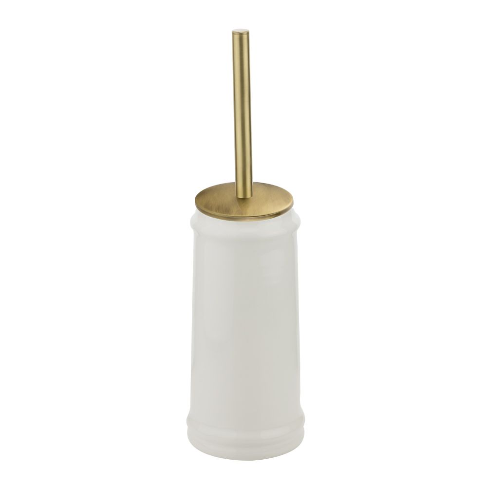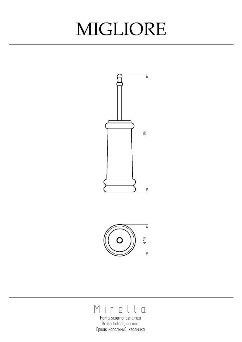 Напольный ершик с керамической колбой серии MIRELLA бренда MIGLIORE   - красивый аксессуар для ванной комнаты. Белая керамика классической формы выглядит эстетично и легко моется.  Материал — латунь, покрытие цвета бронза. Внимание: бронзовое покрытие достаточно деликатное и для ухода рекомендуется протирать изделие мягкой безворсовой тряпочкой с мыльным раствором и вытирать насухо или использовать чистящее средство бренда MIGLIORE для смесителей и аксессуаров с деликатными покрытиями бронза, золото, медь.