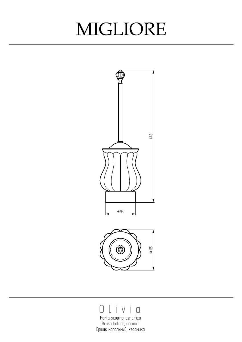 Напольный ершик коллекции OLIVIA бренда MIGLIORE - это функциональный аксессуар для ванной комнаты. Керамическая колба выглядит красиво и эстетично, ее легко мыть.