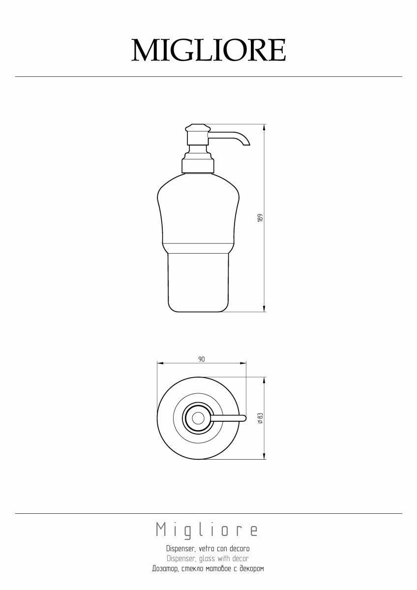 Колба дозатора MIGLIORE предназначена для жидкого мыла или моющего средства (при использовании на кухне). Колба выполнена из высококачественного матового стекла с декором. Помпа дозатора выполнена из латуни в цвете Бронза. Внимание: бронзовое покрытие достаточно деликатное и для ухода рекомендуется протирать изделие мягкой безворсовой тряпочкой с мыльным раствором и вытирать насухо или использовать чистящее средство бренда MIGLIORE для смесителей и аксессуаров с деликатными покрытиями бронза, золото, медь.