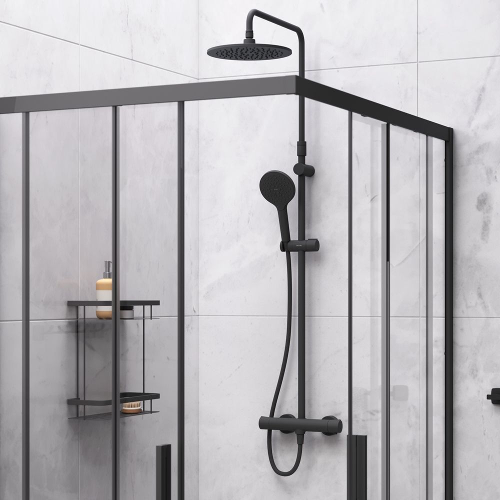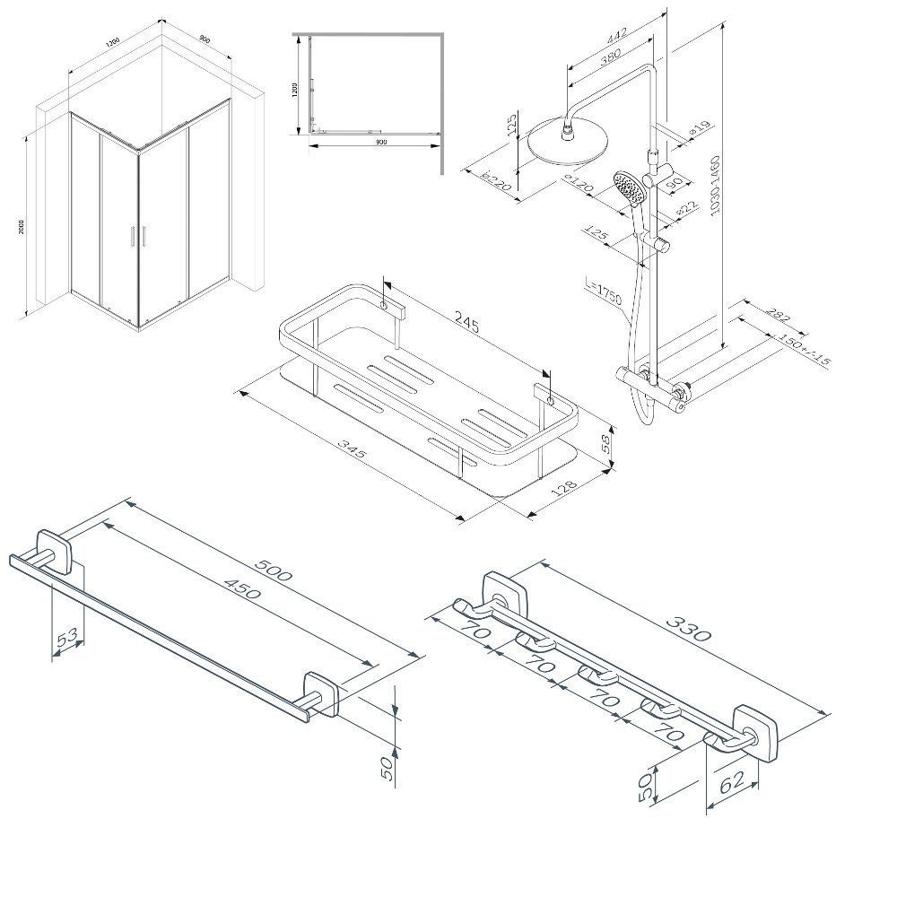 Комплект дополнен термостатической душевой системой с верхним душем и премиальным набором функций. А наличие в комплекте системы хранения облегчит подбор необходимых аксессуаров. Эргономичная двухуровневая полочка вместит гели и шампуни необходимые для принятия душа. Расположите крючок и вешалку рядом с душевым уголком и ваш любимый халат и полотенца всегда будут в быстром доступе.