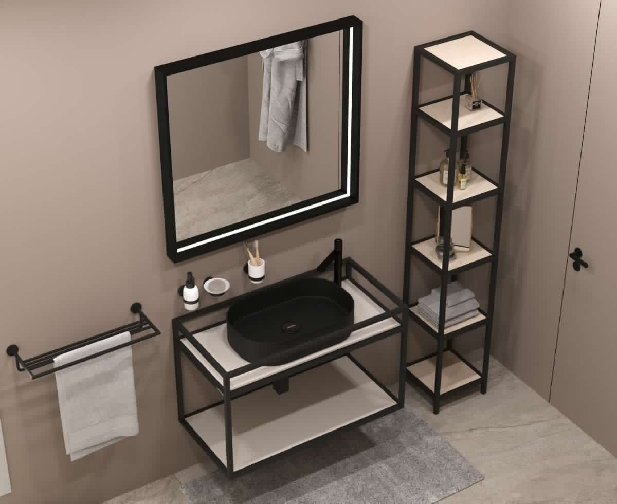 Стильные каркасы тумб и пеналов выполнены из металла, имеют брашированную поверхность