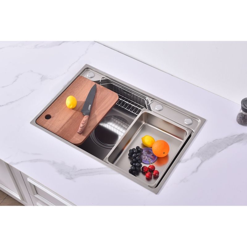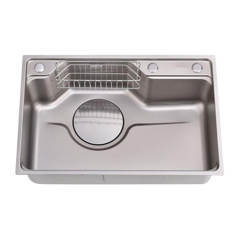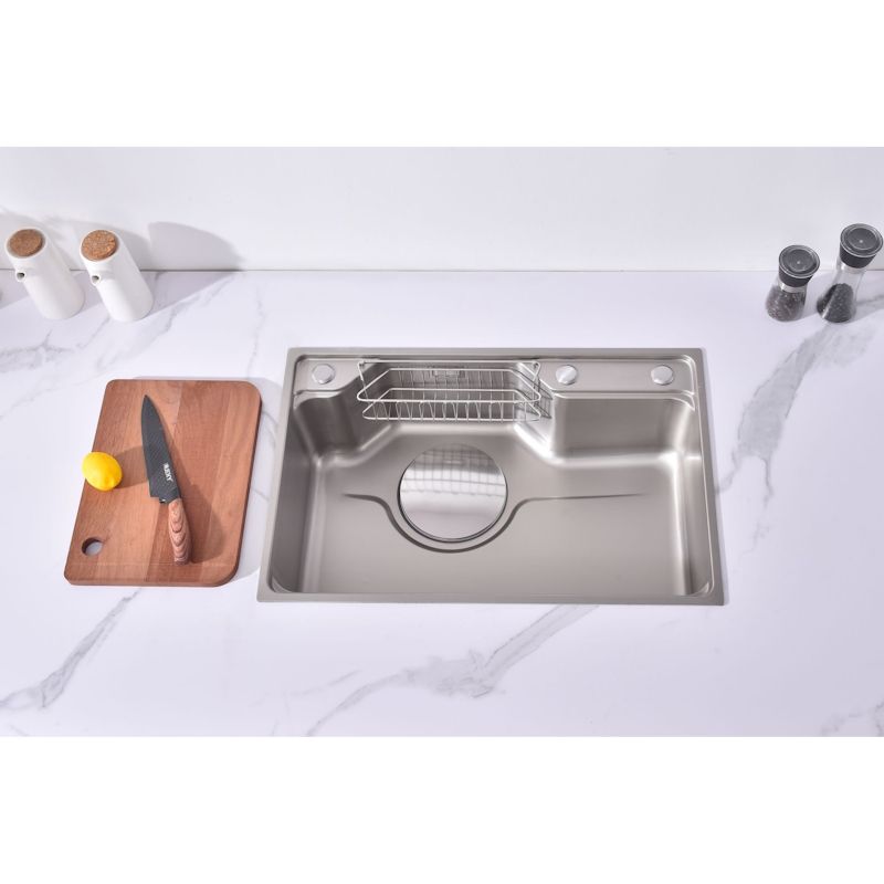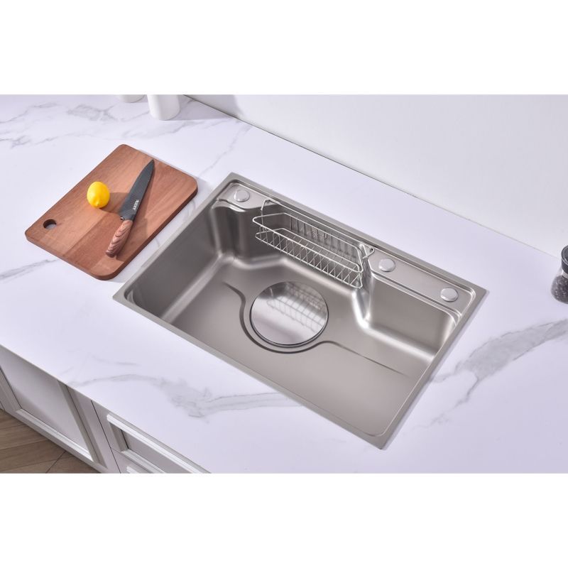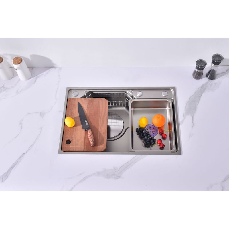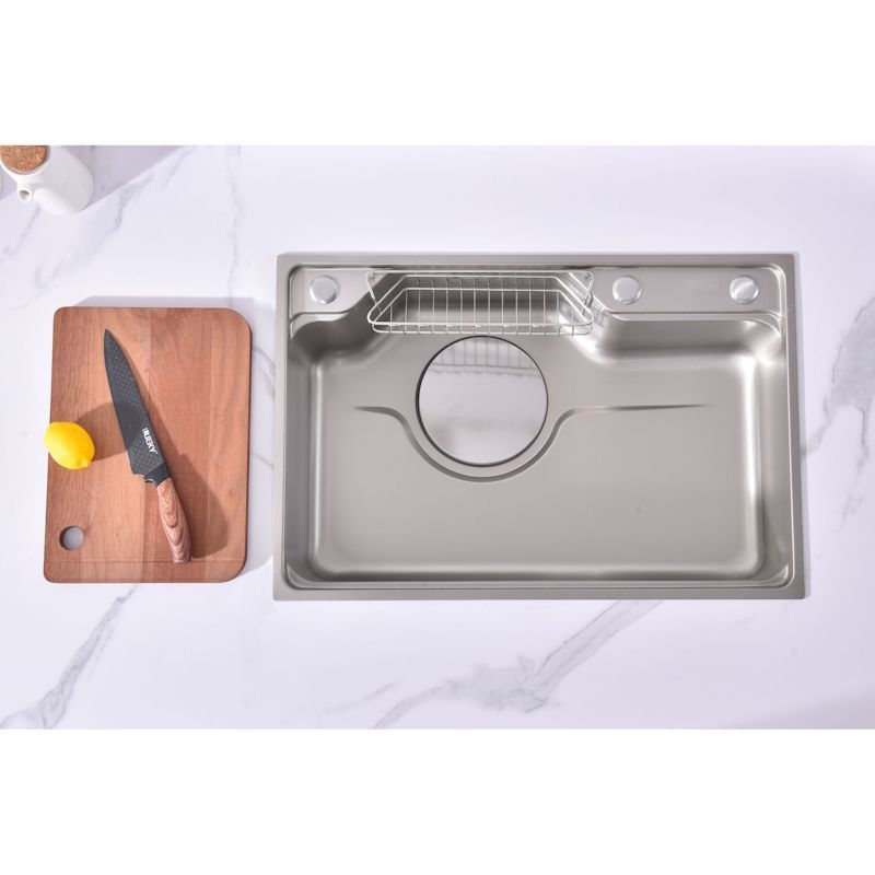 Мойка кухонная Fmark FSC7846L прямоугольная врезная из нержавеющей стали Материал: Нержавеющая сталь AISI 201 Страна производства: Китай Форма: Прямоугольная Способ установки: Врезная сверху столешницы Размеры изделия: длина — 780 мм, ширина — 460 мм, высота — 220 мм Отверстия для монтажа: 1 шт., размер отверстия — 760×440 мм Гарантийный срок: 1 год Упаковка: Картонная коробка размером 84х52х27 см Толщина материала: 0,65 мм Толщина бортика: 3 мм Защитное покрытие: PVD-покрытие Комплект: кухонная мойка, сифон, крышка слива в цвет мойки, корзинка в слив для сбора мусора, корзина для кухонных предметов, разделочная доска Поверхность сатинового цвета с водоотталкивающим покрытием обеспечивает защиту от загрязнений и облегчает уход. Универсальность позволяет устанавливать изделие практически в любую кухню независимо от стиля интерьера. Практичная форма, оптимальные размеры и доступная цена делают данную мойку идеальным выбором для современной кухни.