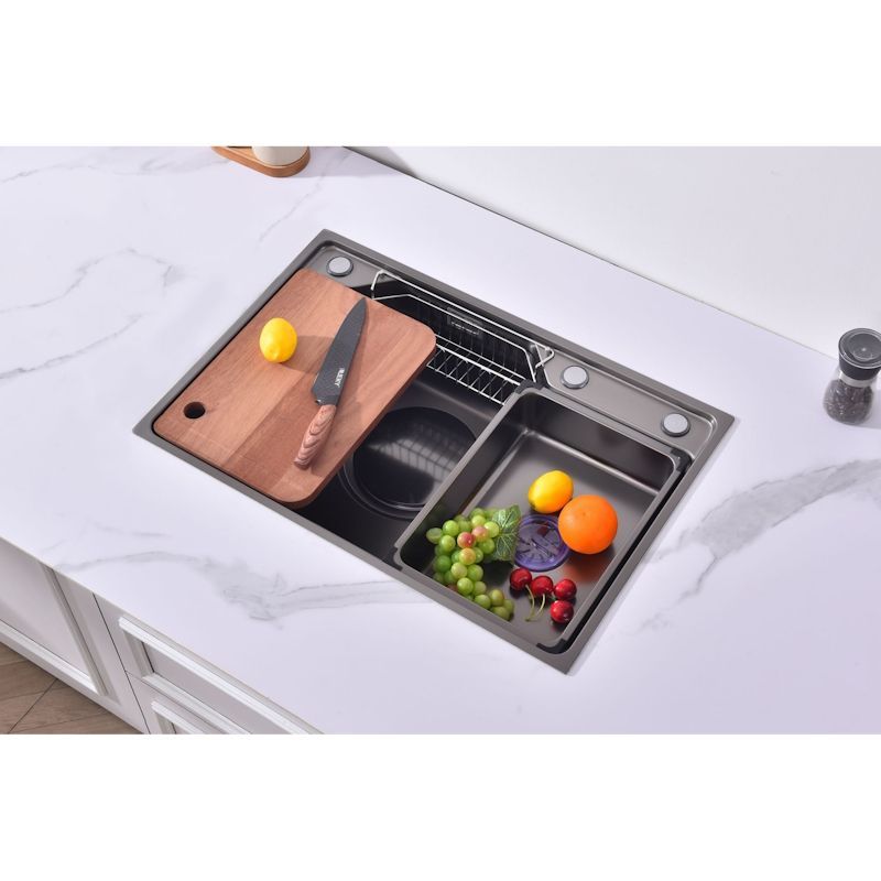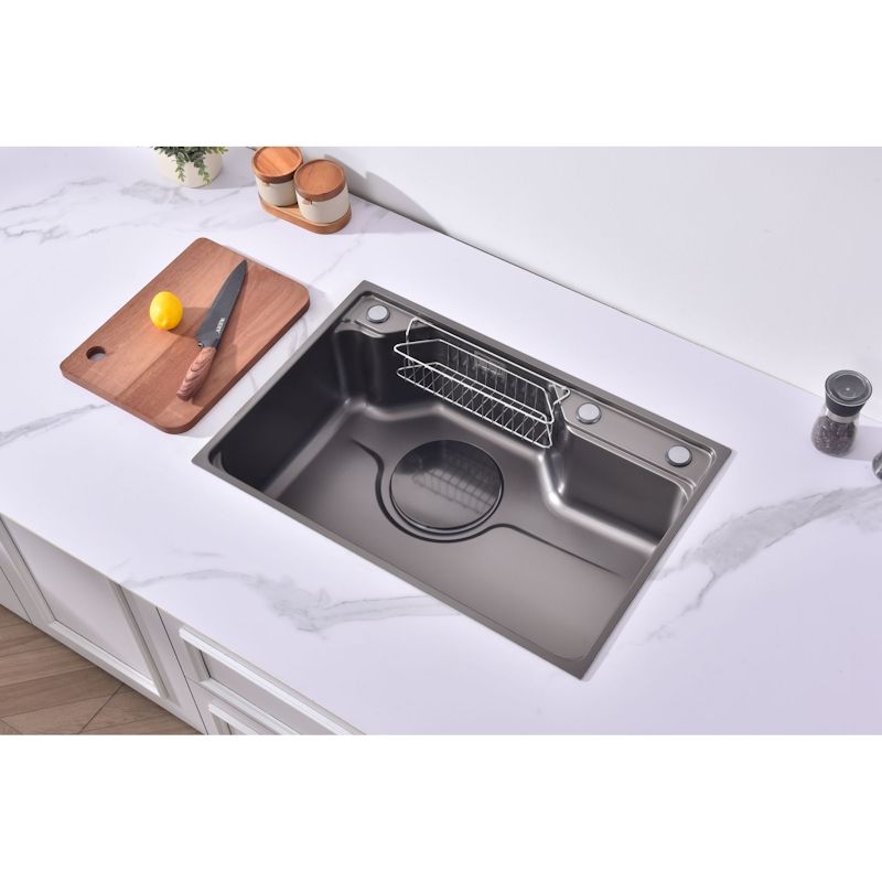 Мойка кухонная Fmark FSC7846Q прямоугольная врезная из нержавеющей стали Материал: Нержавеющая сталь AISI 201 Страна производства: Китай Форма: Прямоугольная Способ установки: Врезная сверху столешницы Размеры изделия: длина — 780 мм, ширина — 460 мм, высота — 220 мм Отверстия для монтажа: 1 шт., размер отверстия — 760×440 мм Гарантийный срок: 1 год Упаковка: Картонная коробка размером 84х52х27 см Толщина материала: 0,65 мм Толщина бортика: 3 мм Защитное покрытие: PVD-покрытие Комплект: кухонная мойка, сифон, крышка слива в цвет мойки, корзинка в слив для сбора мусора, корзина для кухонных предметов, разделочная доска Поверхность графитового цвета с водоотталкивающим покрытием обеспечивает защиту от загрязнений и облегчает уход. Универсальность позволяет устанавливать изделие практически в любую кухню независимо от стиля интерьера. Практичная форма, оптимальные размеры и доступная цена делают данную мойку идеальным выбором для современной кухни.