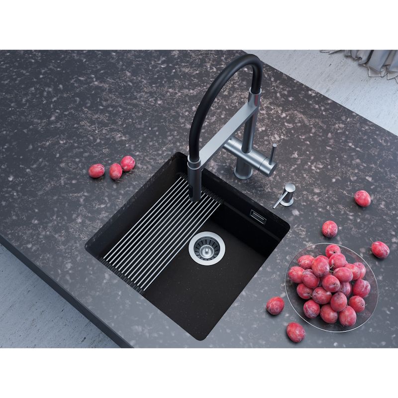 Кухонная мойка Grandex Aqua COMFORT 46U BLACK METALIC. Grandex Aqua – мойки, смесители и аксессуары для кухни от команды, создавшей премиальные столешницы Grandex – символ надежности и стиля. Разработано с опытом, проверено временем. Главные принципы бренда: безопасность, комфорт и надежность. GRANDEX AQUA – это не только имя, но и качество, которое добавит новый уровень комфорта в Вашу жизнь. Материал мойки содержит минимум 80% натурального кварца, который обеспечивает высочайшую прочность и надежность, а также экологичность. Специальные гиброфобные добавки делаю материал не впитывающим и дополнительно защищают мойку от пятен и грязи. Мойка не боится кипятка и выдерживает температуру больше 150 градусов. Удобная полочка внутри чаши позволяет разместить функциональный ролл-мат или разделочную доску. Строгие линии и минимальные радиусы делают мойку эстетически привлекательной и премиальной. Продукция бренда GRANDEX AQUA разработана с учетом опыта профессионалов кухонного рынка, что позволяет ей быть максимально удобной и функциональной, а также украсить собой эстетику вашего кухонного пространства.