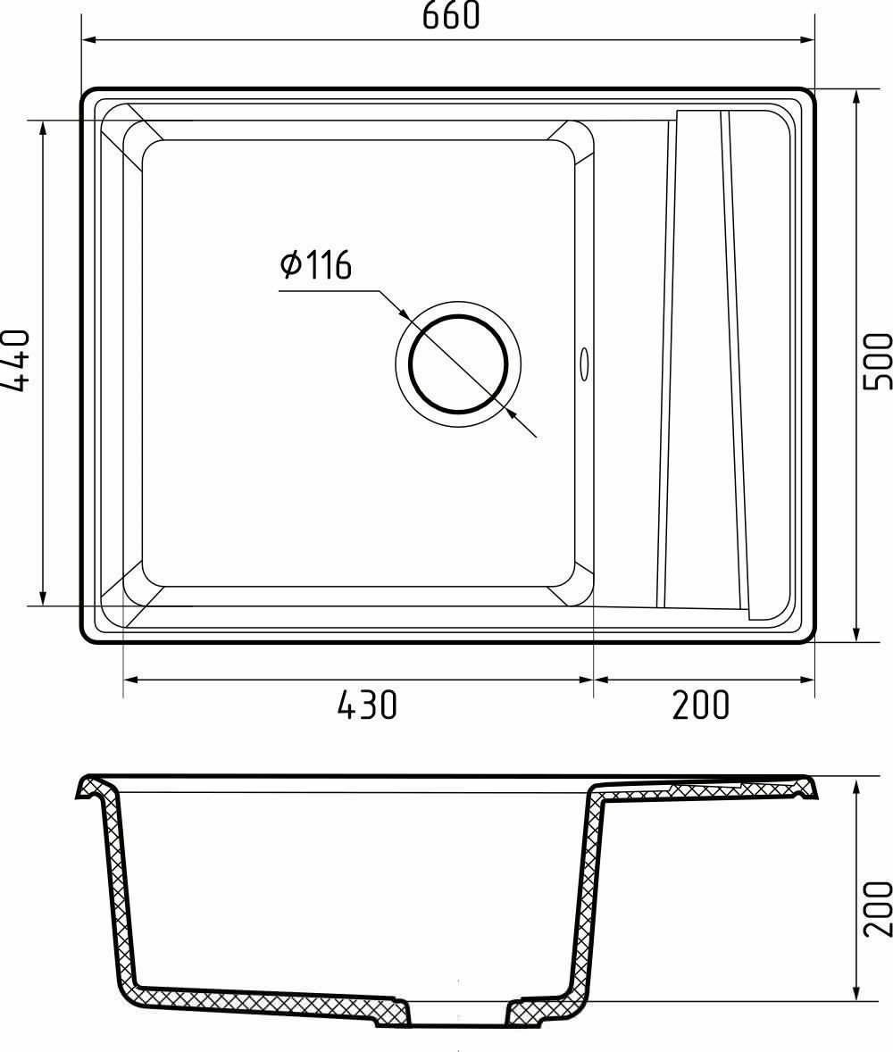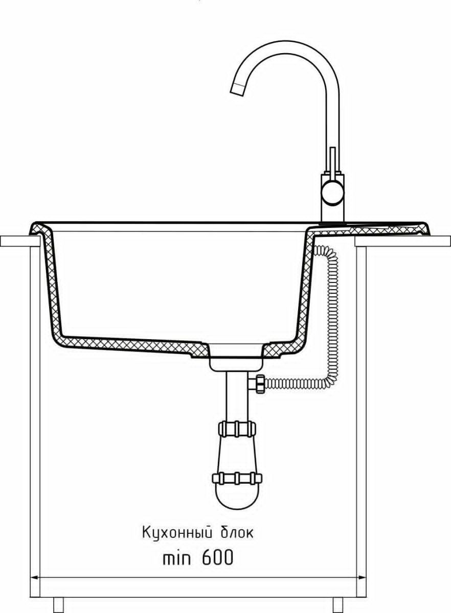 Кухонная мойка врезная из искусственного мрамора, прямоугольной формы, отверстие под смеситель отсутствует, размер чаши составляет 430*440*200, диаметр сливного отверстия составляет 8.89 см. В комплектацию входит: мойка, сливная арматура, паспорт.
