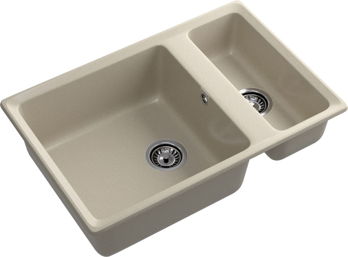 Кухонная мойка врезная из искусственного мрамора, прямоугольной формы, отверстие под смеситель отсутствует, количество чаш составляет 2 шт., размер чашей составляет 450*440*200, 180*440*150, диаметр сливного отверстия составляет 8.89 см. В комплектацию входит: мойка, сливная арматура, паспорт.