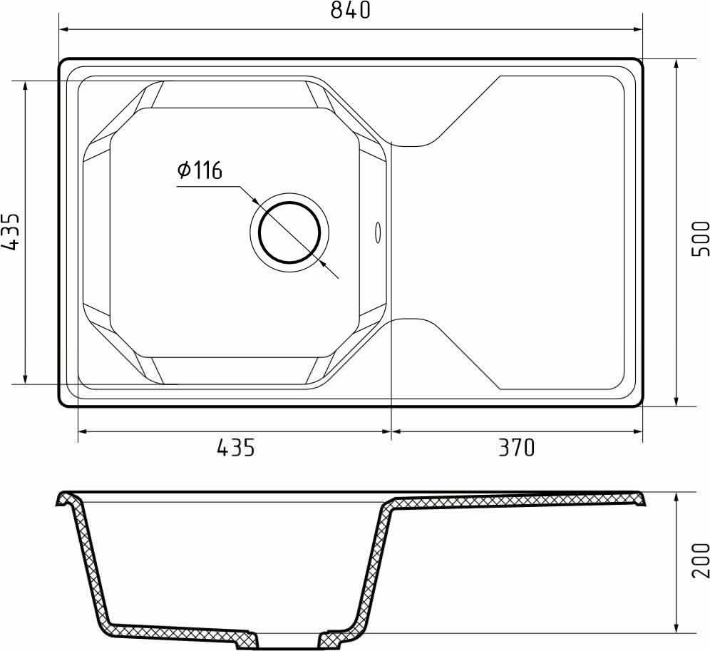 Кухонная мойка врезная из искусственного мрамора, прямоугольной формы, отверстие под смеситель отсутствует, размер чаши составляет 435*435*200, диаметр сливного отверстия составляет 8.89 см. В комплектацию входит: мойка, сливная арматура, паспорт.