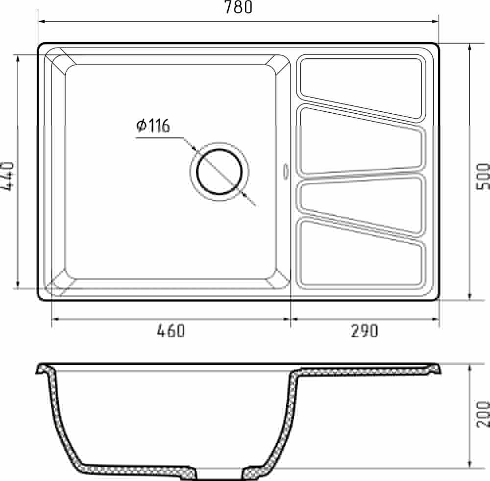 Кухонная мойка врезная из искусственного мрамора, прямоугольной формы, отверстие под смеситель отсутствует, размер чаши составляет 460*440*200, диаметр сливного отверстия составляет 8.89 см. В комплектацию входит: мойка, сливная арматура, паспорт.