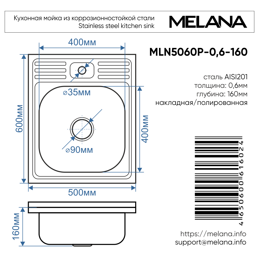 —Кухонная мойка Melana 013 t (*15) 60х50 цвет хром