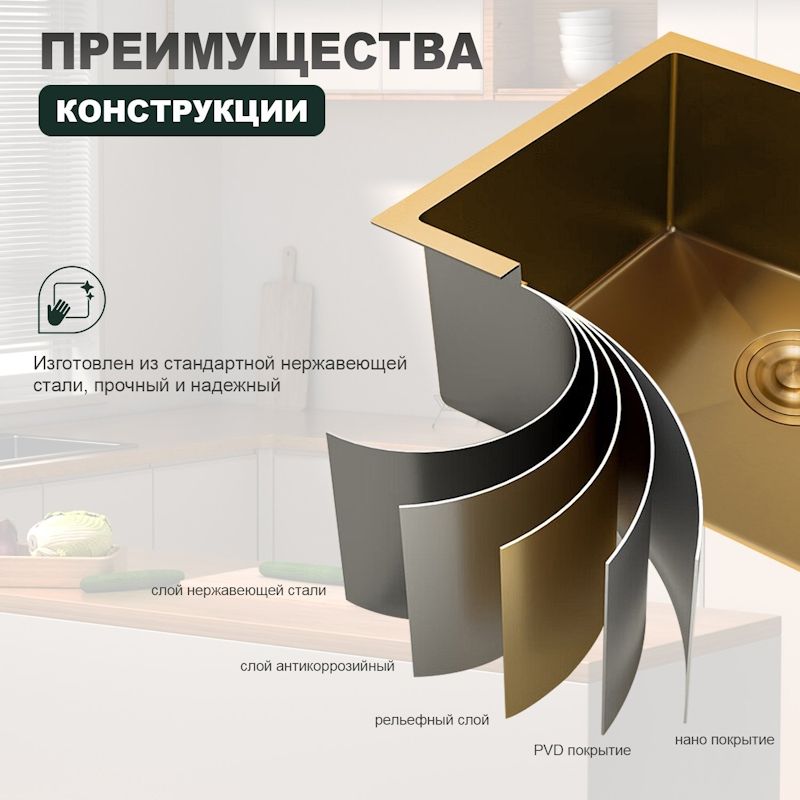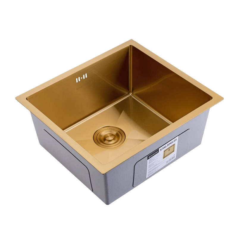 Кухонная мойка Splenka S700.5045.03, золотой сатин. Размер - 500*440*220мм.   Кухонные мойки Splenka отличаются практичностью и современным дизайном. Прямоугольные и квадратные раковины для кухни из нержавейки станут идеальным решением для любой кухни. Нержавеющая врезная мойка - отличный выбор для тех, кто ценит качество и долговечность. Изготовлена из качественной нержавеющей стали, которая не боится ни бытовой химии, ни царапин. Металлическая раковина для кухни добавит вашей кухне современности и функциональности. Удобный универсальный монтаж на ваш выбор: врезным способом, поверх столешницы или подстольный. Комплектующие - сифон с выходом для подключения посудомоечной машины и фильтра для питьевой воды, крепление. Толщина стали: верх - 3 мм / чаша - 0.6 мм