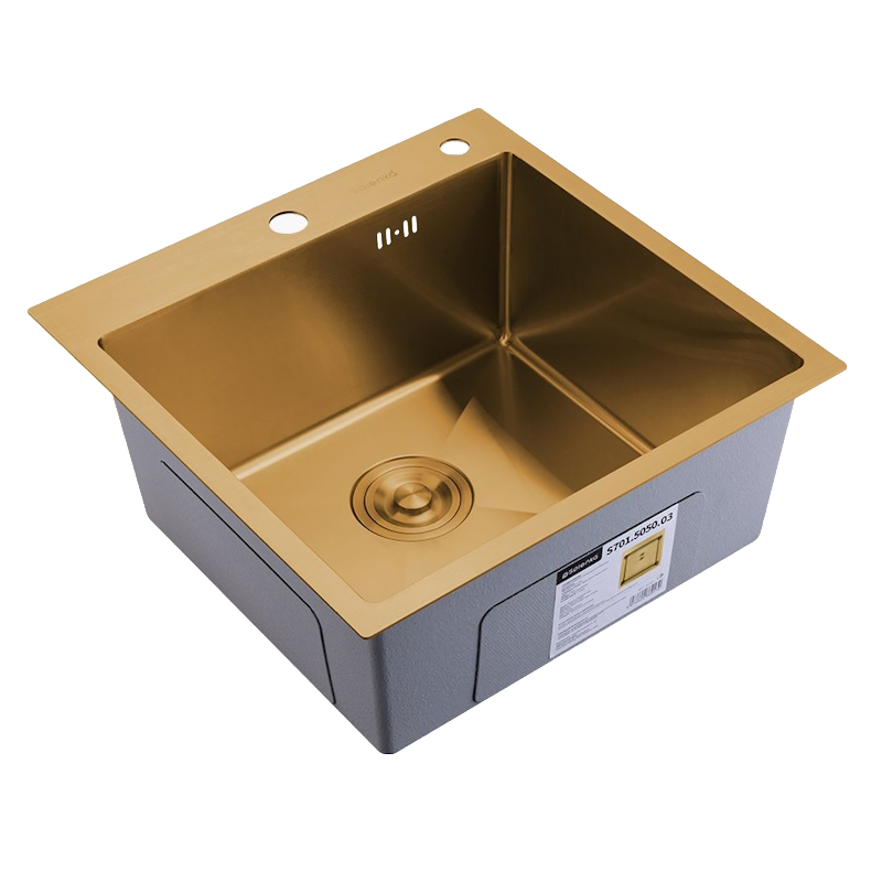 Кухонная мойка Splenka S701.5050.03, золотой сатин. Размер - 500*500*220мм.   Кухонные мойки Splenka отличаются практичностью и современным дизайном. Прямоугольные и квадратные раковины для кухни из нержавейки станут идеальным решением для любой кухни. Нержавеющая врезная мойка - отличный выбор для тех, кто ценит качество и долговечность. Изготовлена из качественной нержавеющей стали, которая не боится ни бытовой химии, ни царапин. Металлическая раковина для кухни добавит вашей кухне современности и функциональности. Удобный универсальный монтаж на ваш выбор: врезным способом, поверх столешницы или подстольный. Комплектующие - сифон с выходом для подключения посудомоечной машины и фильтра для питьевой воды, крепление. Толщина стали: верх - 3 мм / чаша - 0.6 мм