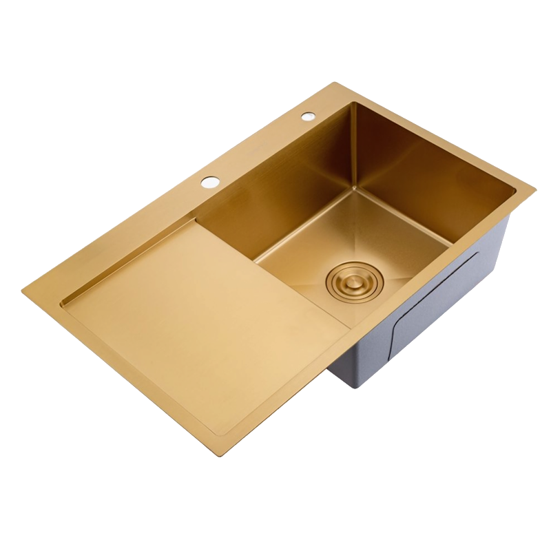 Кухонная мойка Splenka S704.7850.03, золотой сатин. Размер - 780*500*220мм.   Кухонные мойки Splenka отличаются практичностью и современным дизайном. Прямоугольные и квадратные раковины для кухни из нержавейки станут идеальным решением для любой кухни. Нержавеющая врезная мойка - отличный выбор для тех, кто ценит качество и долговечность. Изготовлена из качественной нержавеющей стали, которая не боится ни бытовой химии, ни царапин. Металлическая раковина для кухни добавит вашей кухне современности и функциональности. Удобный универсальный монтаж на ваш выбор: врезным способом, поверх столешницы или подстольный. Комплектующие - сифон с выходом для подключения посудомоечной машины и фильтра для питьевой воды, крепление. Толщина стали: верх - 3 мм / чаша - 0.6 мм