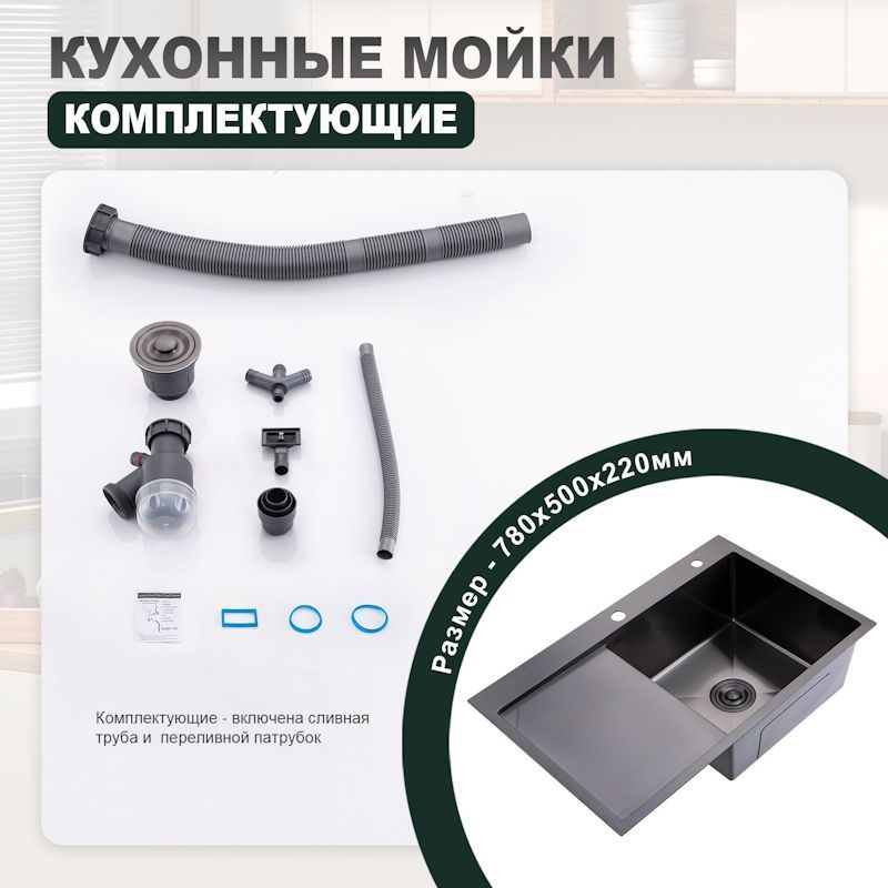 Кухонная мойка Splenka S704.7850.09, графит. Размер - 780*500*220мм. Кухонные мойки Splenka отличаются практичностью и современным дизайном. Прямоугольные и квадратные раковины для кухни из нержавейки станут идеальным решением для любой кухни. Нержавеющая врезная мойка - отличный выбор для тех, кто ценит качество и долговечность. Изготовлена из качественной нержавеющей стали, которая не боится ни бытовой химии, ни царапин. Металлическая раковина для кухни добавит вашей кухне современности и функциональности. Удобный универсальный монтаж на ваш выбор: врезным способом, поверх столешницы или подстольный. Комплектующие - сифон с выходом для подключения посудомоечной машины и фильтра для питьевой воды, крепление. Толщина стали: верх - 3 мм / чаша - 0.6 мм