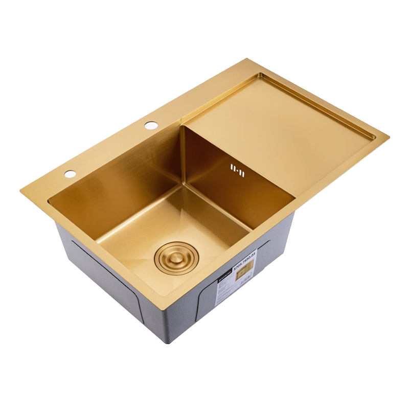 Кухонная мойка Splenka S705.7850.03, золотой сатин. Размер - 780*500*220мм.   Кухонные мойки Splenka отличаются практичностью и современным дизайном. Прямоугольные и квадратные раковины для кухни из нержавейки станут идеальным решением для любой кухни. Нержавеющая врезная мойка - отличный выбор для тех, кто ценит качество и долговечность. Изготовлена из качественной нержавеющей стали, которая не боится ни бытовой химии, ни царапин. Металлическая раковина для кухни добавит вашей кухне современности и функциональности. Удобный универсальный монтаж на ваш выбор: врезным способом, поверх столешницы или подстольный. Комплектующие - сифон с выходом для подключения посудомоечной машины и фильтра для питьевой воды, крепление. Толщина стали: верх - 3 мм / чаша - 0.6 мм