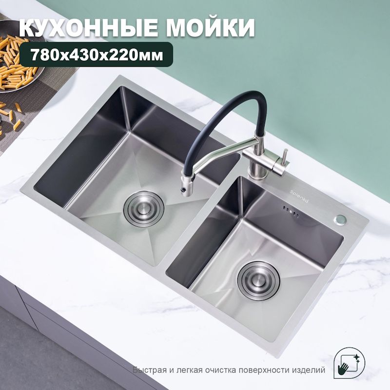Кухонная мойка Splenka S706.7843.05, сатин. Размер - 780*430*220мм. Кухонные мойки Splenka отличаются практичностью и современным дизайном. Прямоугольные и квадратные раковины для кухни из нержавейки станут идеальным решением для любой кухни. Нержавеющая врезная мойка - отличный выбор для тех, кто ценит качество и долговечность. Изготовлена из качественной нержавеющей стали, которая не боится ни бытовой химии, ни царапин. Металлическая раковина для кухни добавит вашей кухне современности и функциональности. Удобный универсальный монтаж на ваш выбор: врезным способом, поверх столешницы или подстольный. Комплектующие - сифон с выходом для подключения посудомоечной машины и фильтра для питьевой воды, крепление. Толщина стали: верх - 3 мм / чаша - 0.6 мм