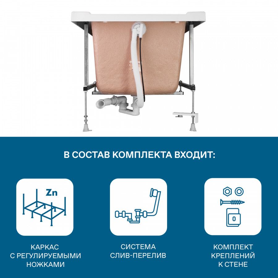 Монтажный комплект подходит для акриловой ванны из коллекции САНТОРИНИ 170х70 см. (Арт. WH302487) и состоит из каркаса, комплекта креплений к стене, системы слива-перелива.