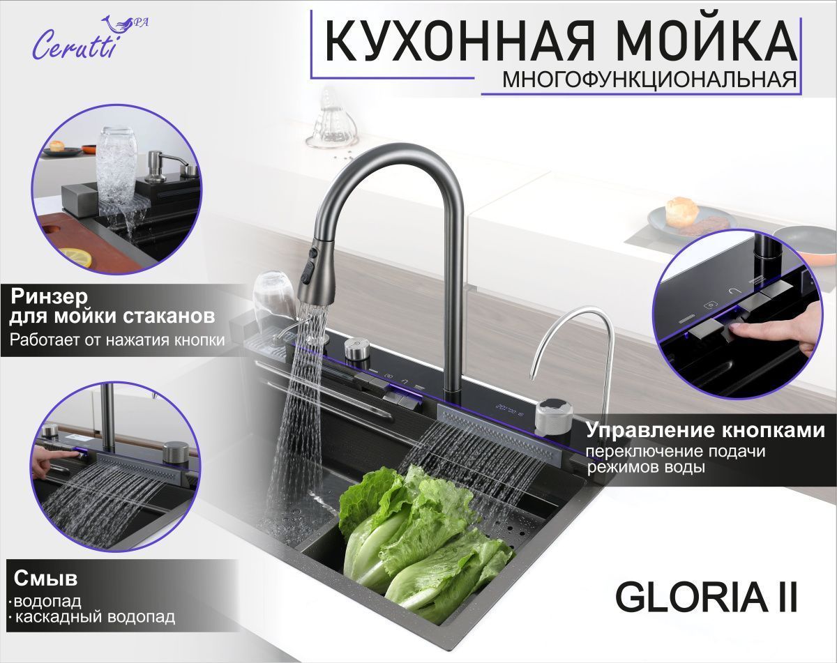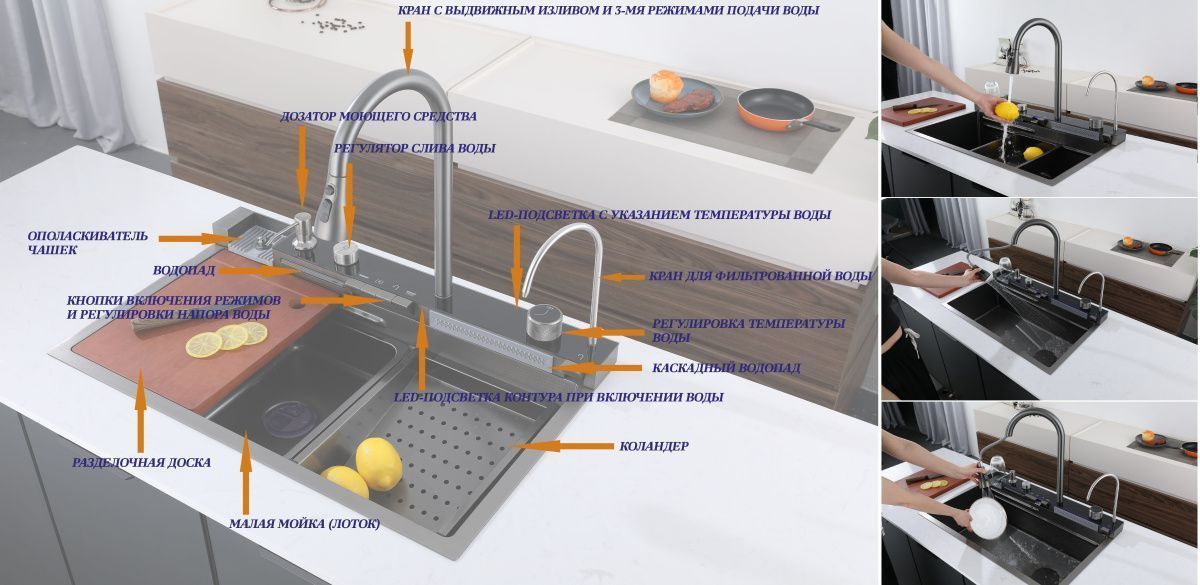 Клавишная панель переключения режимов – позволяет простым нажатием на клавишу выбрать нужный режим: каскадный водопад/ смеситель/ водопад/ мойка чашек.