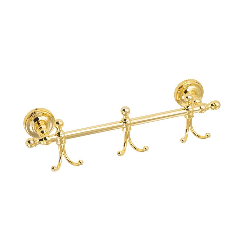 Планка  с 3-мя крючками серии MIRELLA бренда MIGLIORE- многофункциональный аксессуар, который можно использовать в ванной комнате, в сауне, на кухне, в коридоре или кладовке. Общая длина составляет 36 см, 3 крючка классической формы расположены на достаточном удалении друг от друга, что позволит удобно разместить любые вещи и большие полотенца. Изделие выполнено из высококачественной латуни и имеет гальваническое покрытие золотом 24 карата. Внимание: золотое покрытие очень деликатное и для ухода рекомендуется использовать чистящее средство бренда MIGLIORE для смесителей и аксессуаров с деликатными покрытиями бронза, золото, медь и протирать мягкой ветошью.