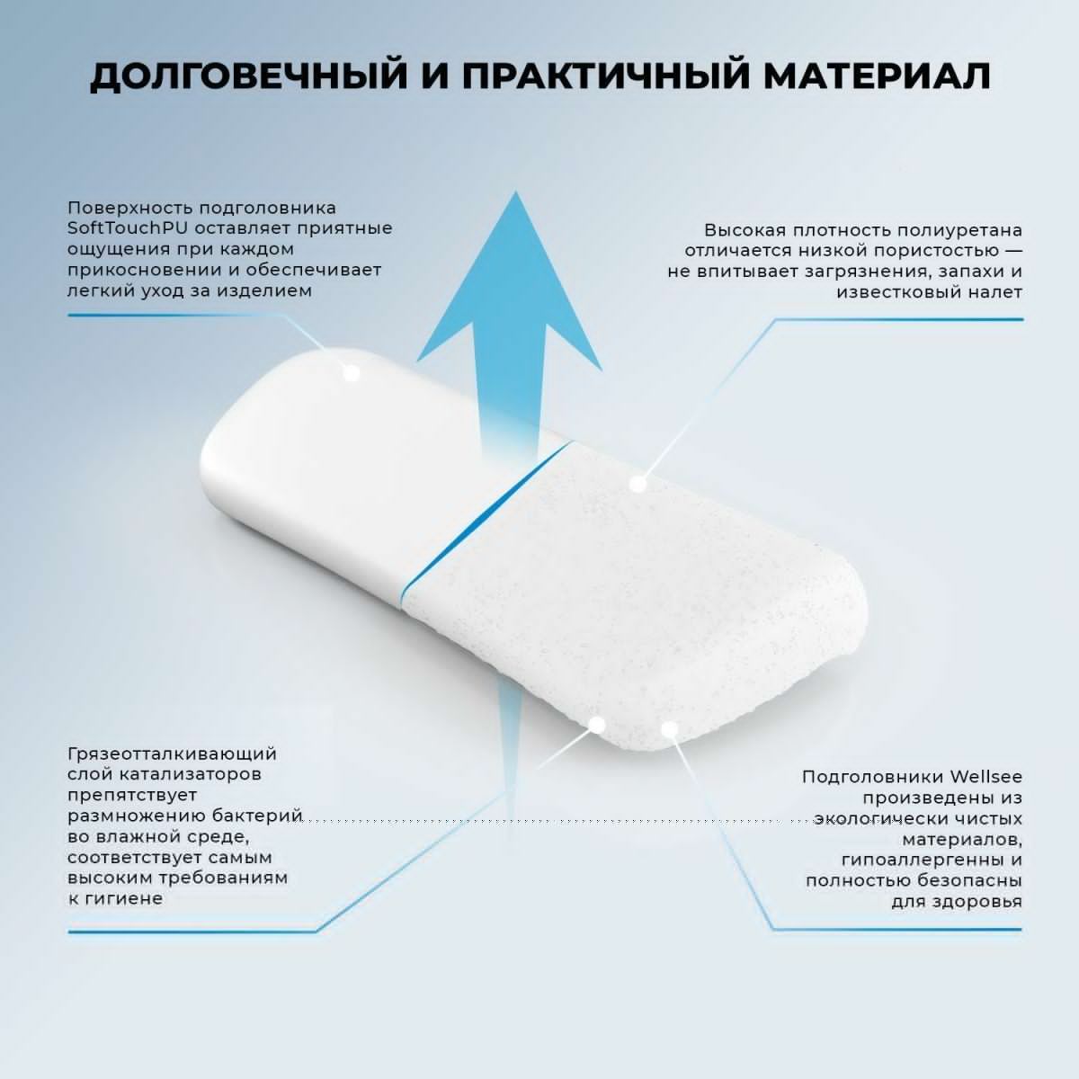 Мягкая подушка для ванны Wellsee изготавливается из экологичного полиуретана SoftTouchPU. В процессе полимеризации поверхность подголовника приобретает идеальную гладкость, а его внутренняя структура обретает способность адаптироваться к изгибам тела, обеспечивая максимально комфортное положение во время купания.