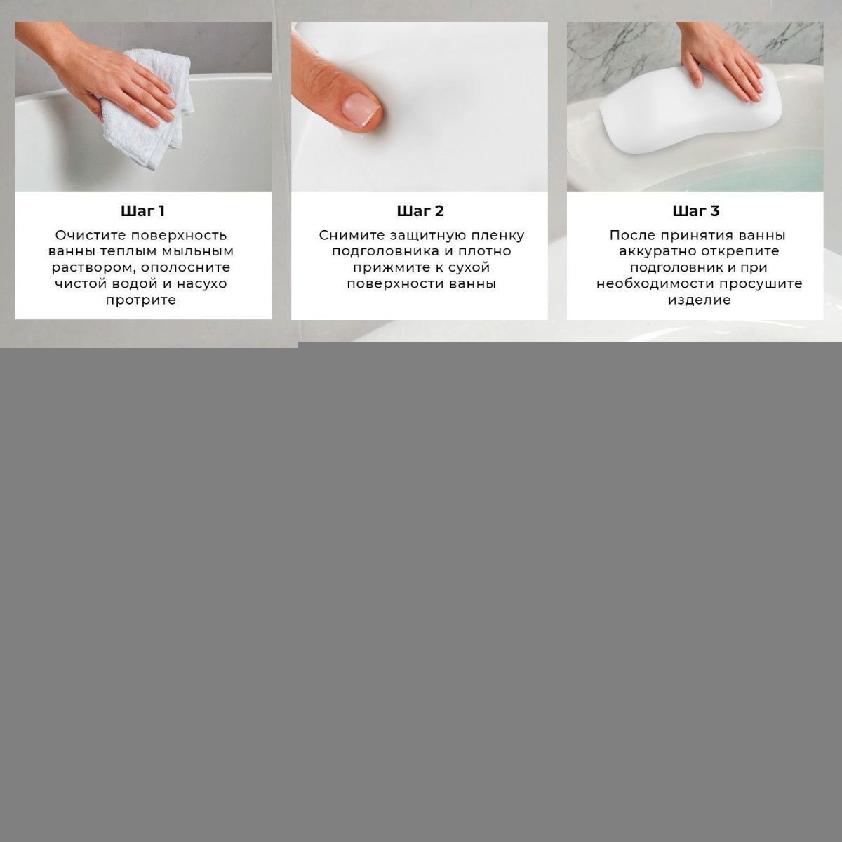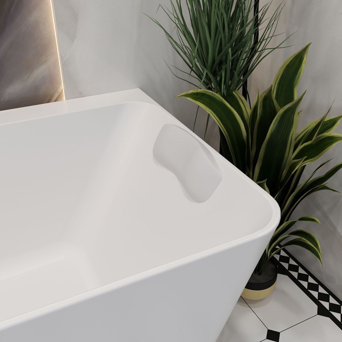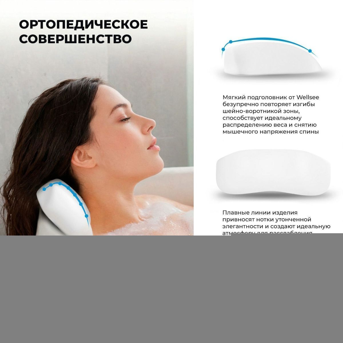 Материал подголовника — вспененный полиуретан с гелевой структурой, что делает его мягким и эластичным. Процесс полимеризации придает поверхности гладкую текстуру, обеспечивая дополнительную влагостойкость. Подушка с легкостью адаптируется под различные формы и размеры ванн, а также идеально соответствует изгибам шейно-воротникой зоны.