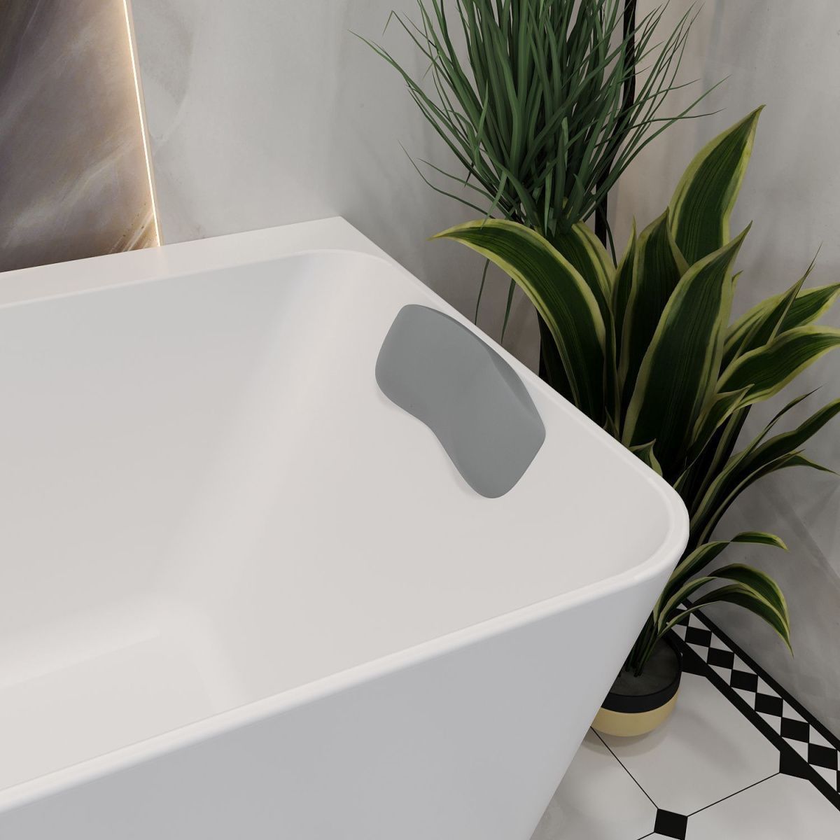Материал подголовника — вспененный полиуретан с гелевой структурой, что делает его мягким и эластичным. Процесс полимеризации придает поверхности гладкую текстуру, обеспечивая дополнительную влагостойкость. Подушка с легкостью адаптируется под различные формы и размеры ванн, а также идеально соответствует изгибам шейно-воротникой зоны.