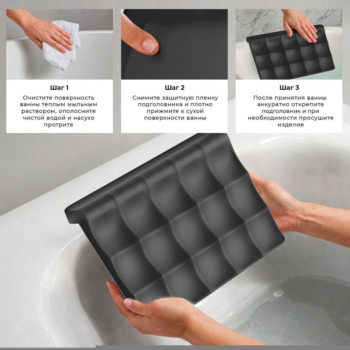 Материал подголовника — вспененный полиуретан с гелевой структурой, что делает его мягким и эластичным. Процесс полимеризации придает поверхности гладкую текстуру, обеспечивая дополнительную влагостойкость. Подушка с легкостью адаптируется под различные формы и размеры ванн, а также идеально соответствует изгибам шейно-воротникой зоны.