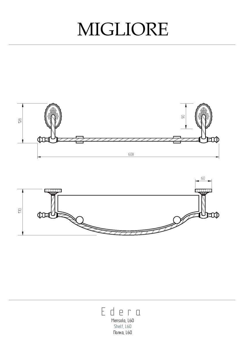 Полка с галереей коллекции EDERA бренда MIGLIORE длиной 65 см — это функциональный аксессуар для ванной комнаты в классическом стиле. Полка вешается над раковиной. На ней можно разместить все необходимые косметические средства, которые будут всегда у вас под рукой.  Ограничительпо переднему краю полки не позволит упасть тюбикам и предметам. Благодаря витым элементам и необычной овальной розетке аксессуары коллекции EDERA будут смотреться элегантно и оригинально в классическом интерьере ванной комнаты.