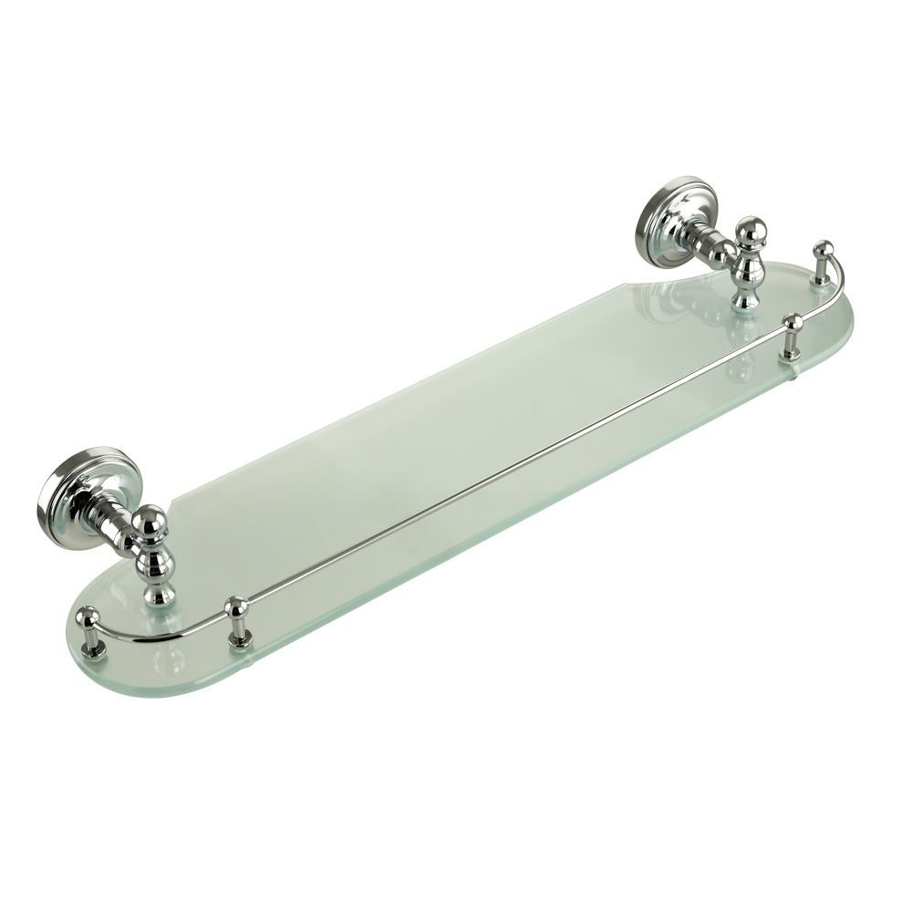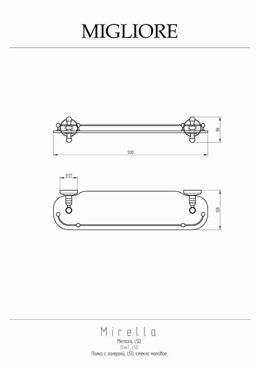 Полка с галереей серии MIRELLA бренда MIGLIORE длиной 50 см - это функциональный аксессуар для ванной комнаты в классическом стиле. Полка вешается над раковиной. На ней вы сможете разместить все необходимые вам косметические средства, которые будут всегда у вас под рукой. Ограничитель по переднему краю полки не позволит упасть тюбикам и предметам. Стекло легко чистится тряпочкой и/или средством для чистки стекол. Изделие выполнено из латуни и имеет высококачественное хромо-никелиевое покрытие, которое при правильном уходе надолго сохранит  свой блеск. Рекомендуется использовать чистящее средство бренда MIGLIORE для смесителей и аксессуаров с хромированным покрытием.