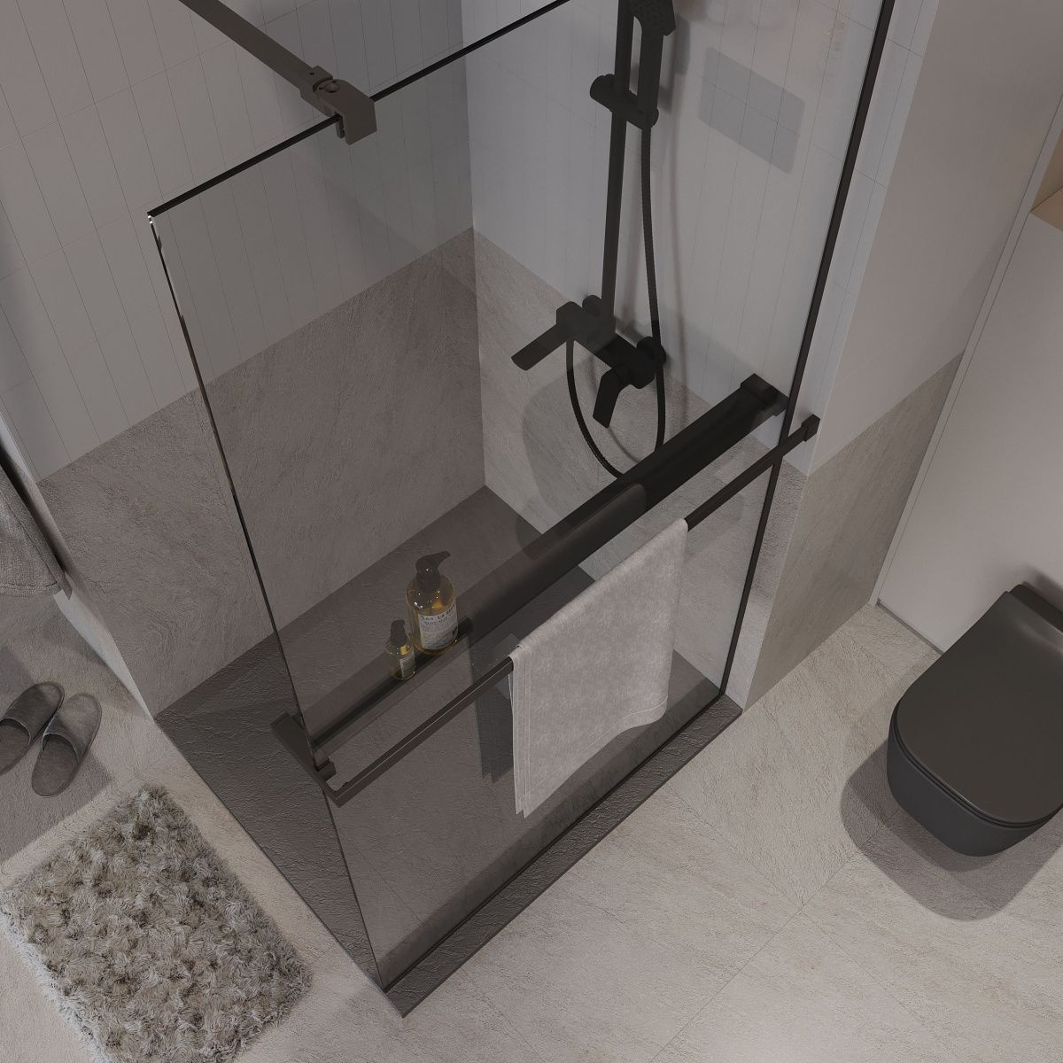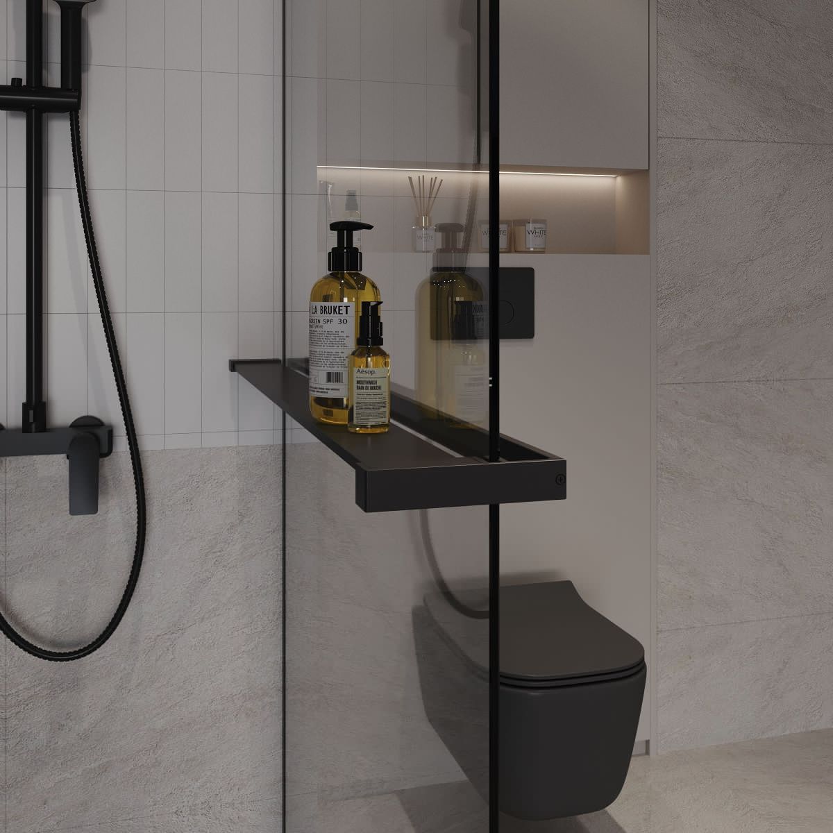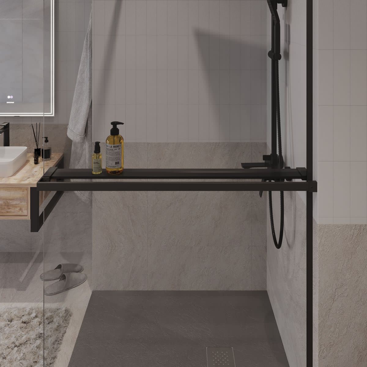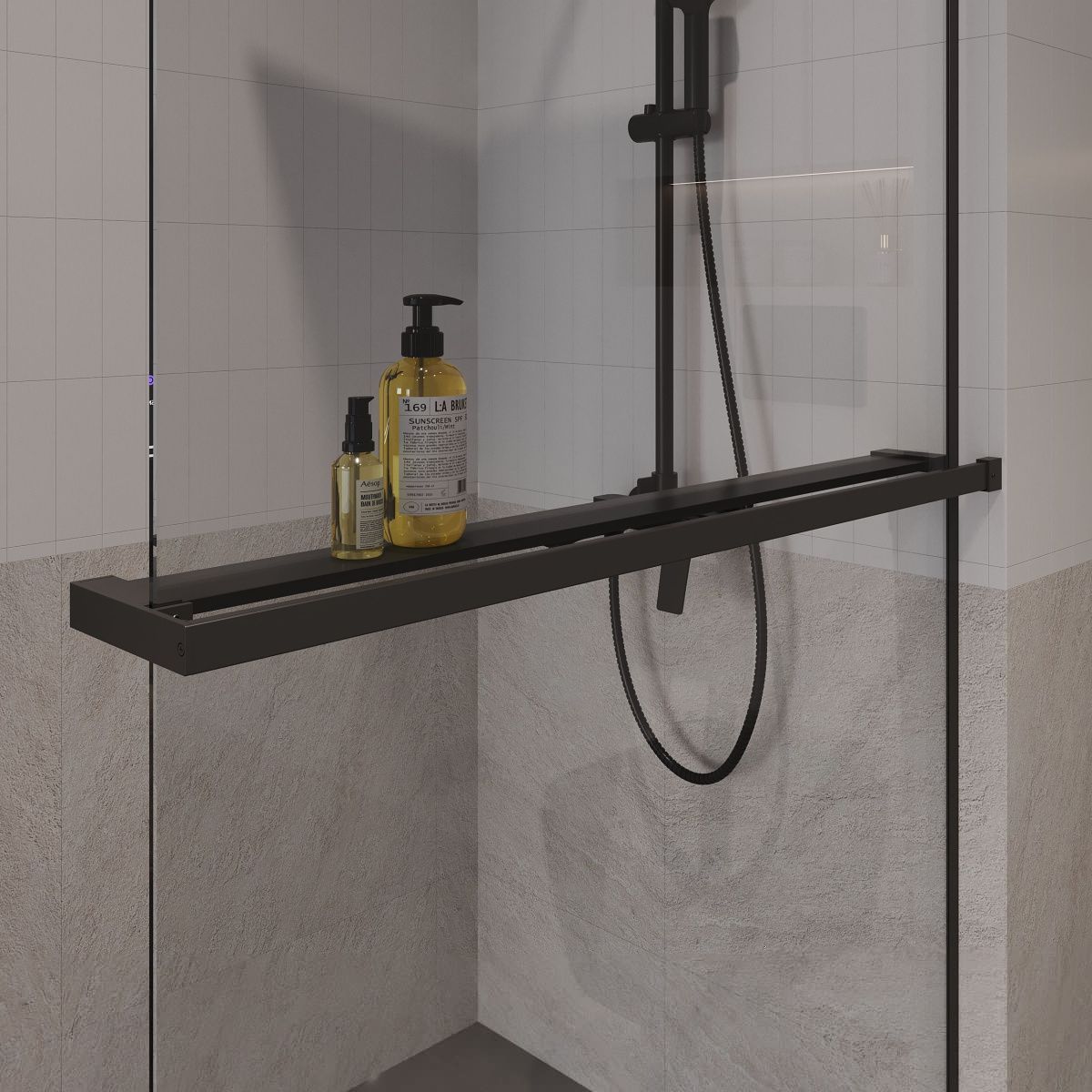 Полка-вешалка NG9075B (90 см)- это функциональное и удобное решение для хранения ванных принадлежностей. Полка подходит к любой неподвижной душевой перегородке или шторке для ванной без обрамления стекла профилем или уплотнителем.  Возможна установка на стекло толщиной 6/8/10 мм. Ширина полки 7,5 см, длина 90 см. На обратной стороне полки - держатель для полотенец. Полка-вешалка изготовлена из анодированного алюминия и имеет миниммалистичный и стильный дизайн, который отлично сочетается с любым интерьером. Она имеет прочную и долговечную конструкцию, которая обеспечивает надежное крепление к стене и удобство использования. С помощью данной полки-вешалки вы сможете рационально организовать пространство и сохранить порядок. Фиксируется на три винта и дюбели. Максимальная нагрузка 5 кг.