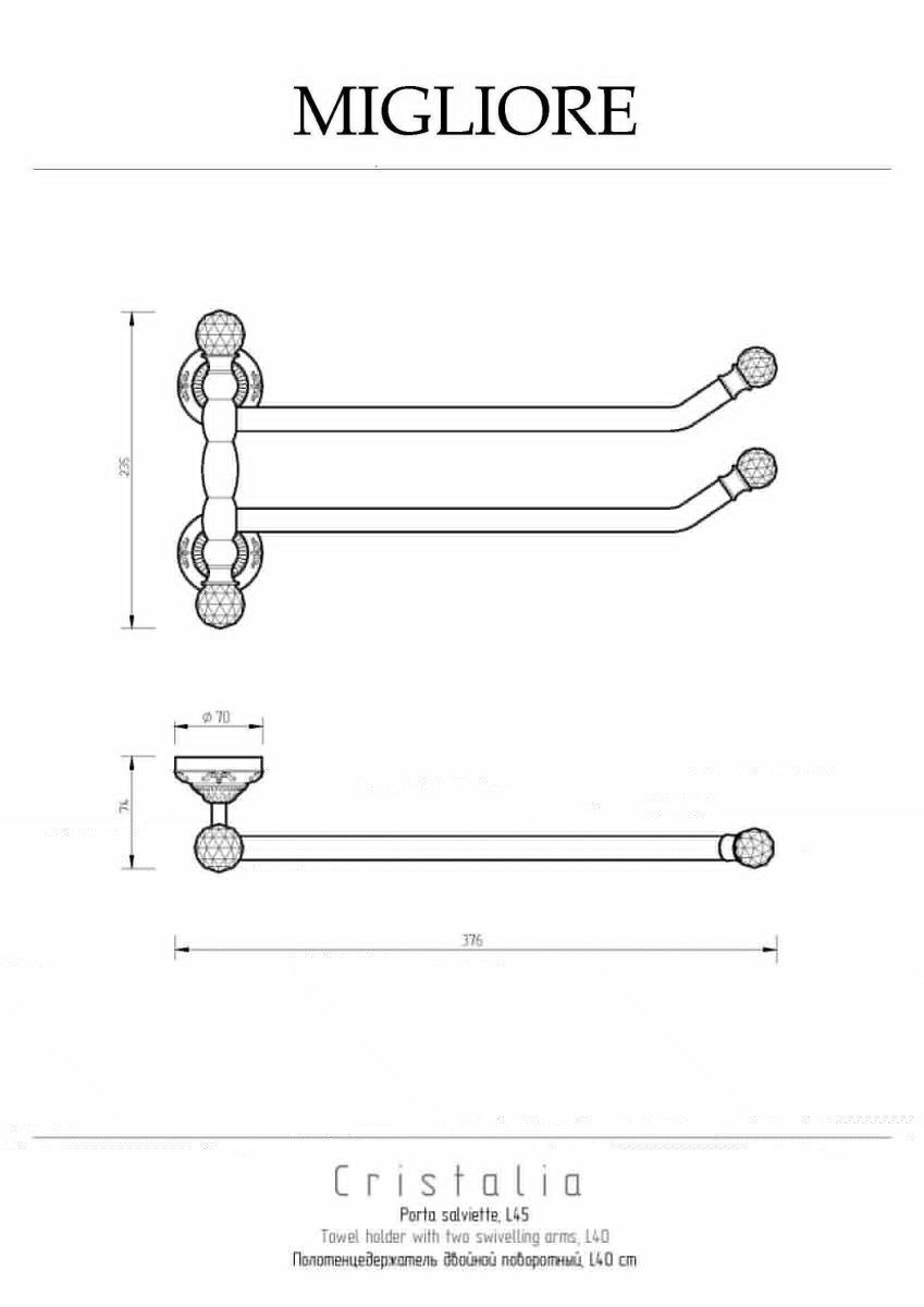 Полотенцедержатель коллекции CRISTALIA бренда MIGLIORE  - функциональный аксессуар для ванной комнаты. Чтобы повесить его достаточно небольшого пространства, и вы можете развернуть его держатели в одну или другую сторону в зависимости от наличия места на стене. Аксессуар украшен кристаллами Сваровски.