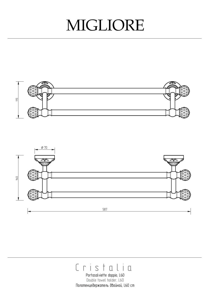 Полотенцедержатель двойной коллекции CRISTALIA бренда MIGLIORE  - функциональный аксессуар для ванной комнаты. Его длина 60 см подходит для любого полотенца для рук, лица или тела. Аксессуар украшен кристаллами Сваровски.