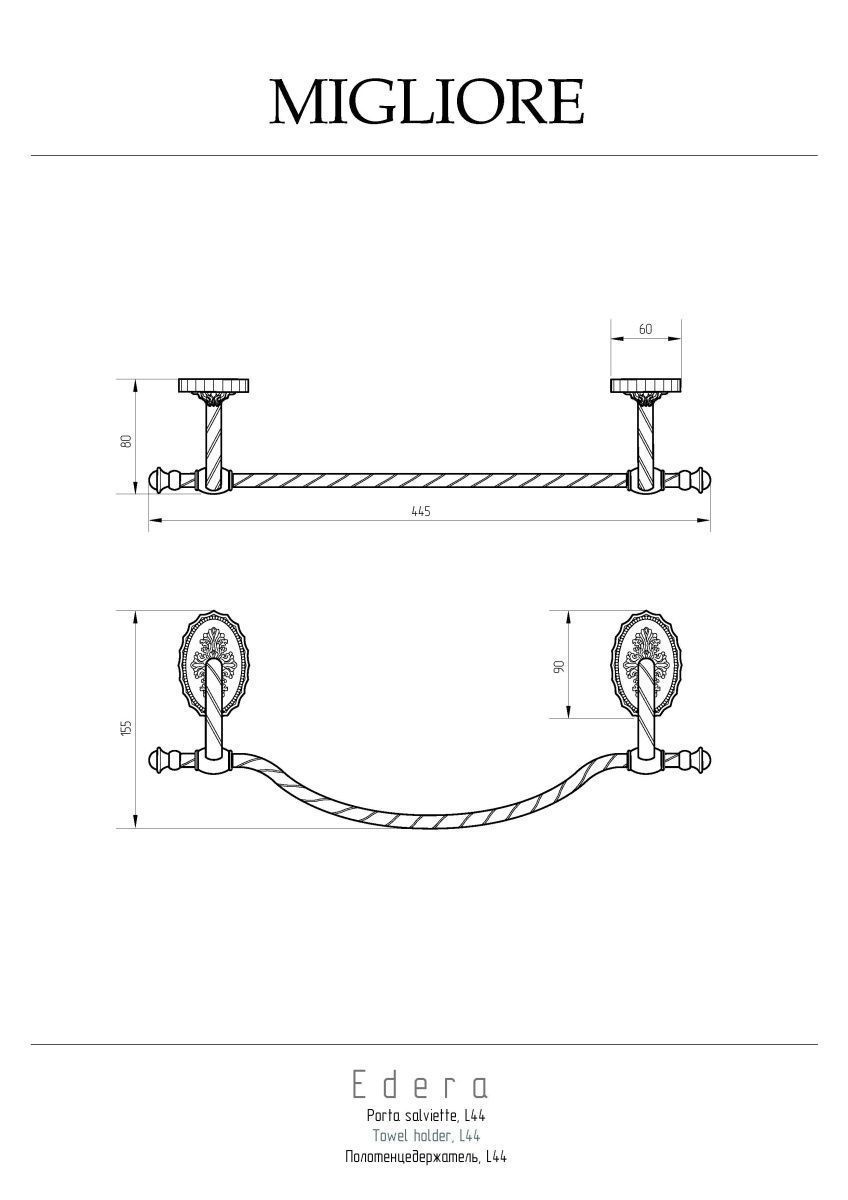 Полотенцедержатель коллекции EDERA бренда MIGLIORE  - функциональный аксессуар для ванной комнаты. Его длина 44 см, что позволит разместить его даже на небольшом пространстве. Используется, как правило, для небольшого полотенца для рук. Также удобен рядом с биде. Благодаря витым элементам и необычной овальной розетке аксессуары коллекции EDERA будут смотреться элегантно и оригинально в классическом интерьере ванной комнаты.