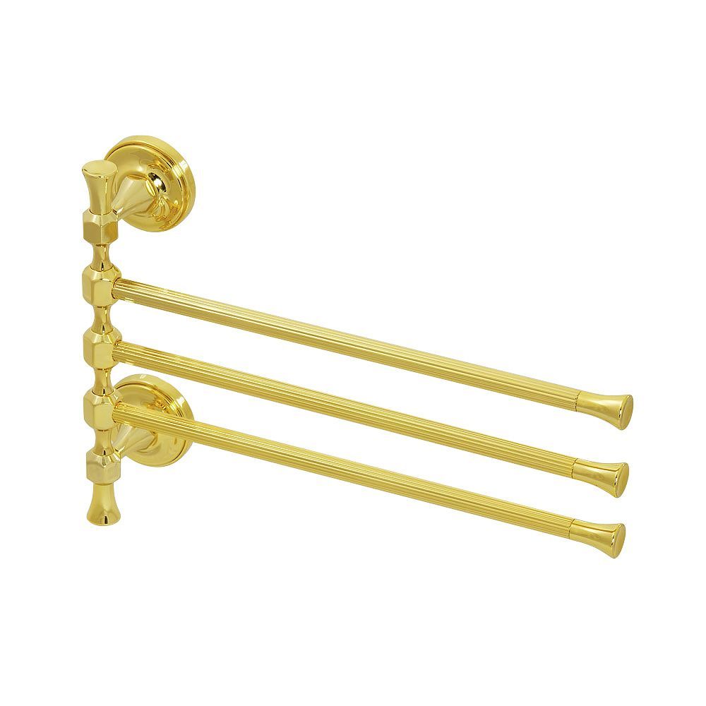 Полотенцедержатель тройной поворотный серии FORTUNA бренда MIGLIORE длиной 32 см очень удобен в использовании. Чтобы повесить его достаточно небольшого пространства, держатели можно развернуть в одну или другую сторону в зависимости от места на стене. Изделие выполнено из высококачественной латуни и имеет гальваническое покрытие золотом 24 карата. Внимание: золотое покрытие очень деликатное и для ухода рекомендуется использовать чистящее средство бренда MIGLIORE для смесителей и аксессуаров с деликатными покрытиями бронза, золото, медь и протирать мягкой ветошью.