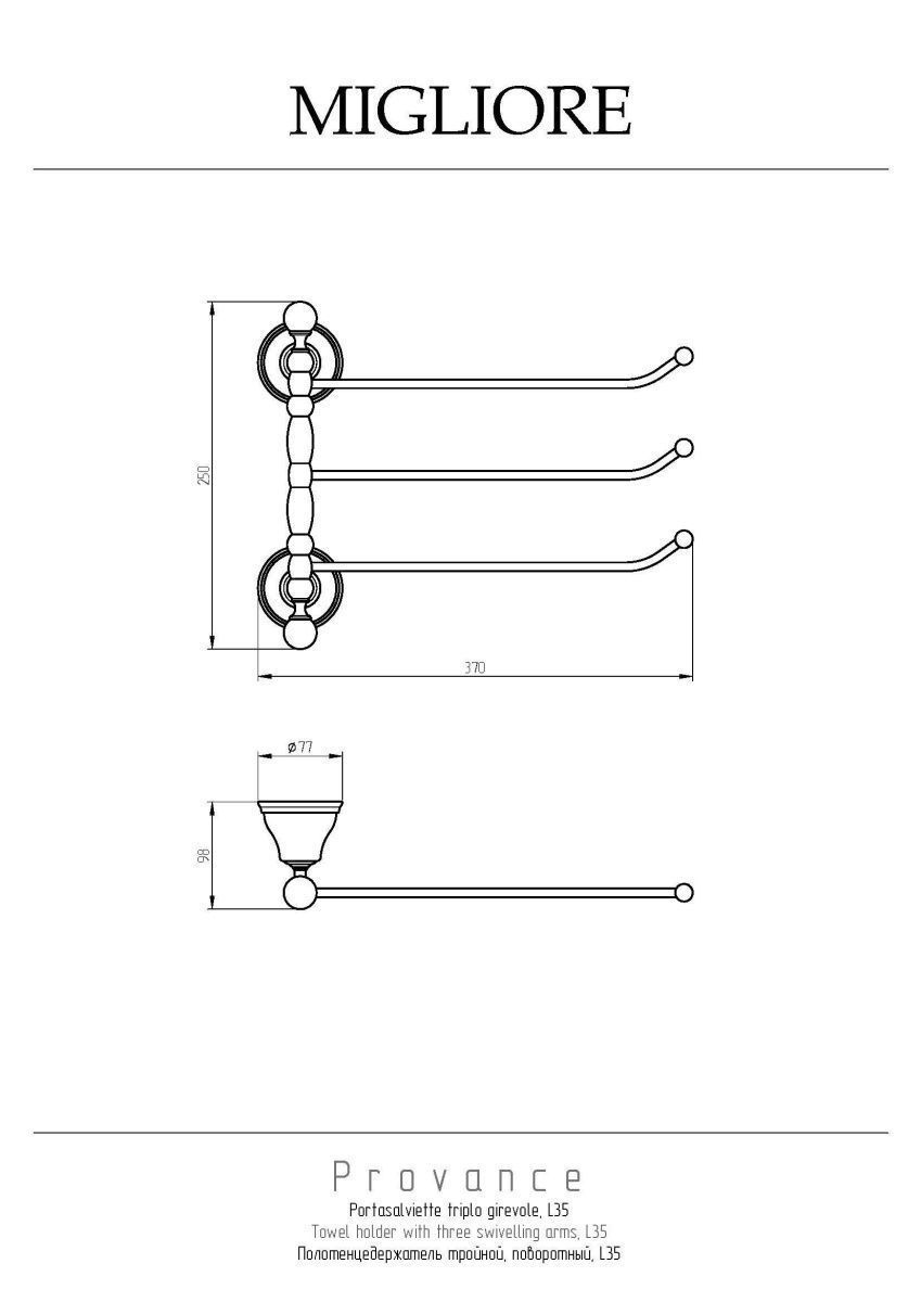 Аксессуары коллекции PROVANCE бренда MIGLIORE имеют нежный цветочный декор на керамике и создают уют в ванной комнате в классическом или рустикальном стиле. Полотенцедержатель тройной поворотный коллекции PROVANCE длиной 35 см очень удобен в использовании — для него достаточно небольшого пространства, и  держатели можно развернуть в одну или другую сторону в зависимости от наличия места на стене.