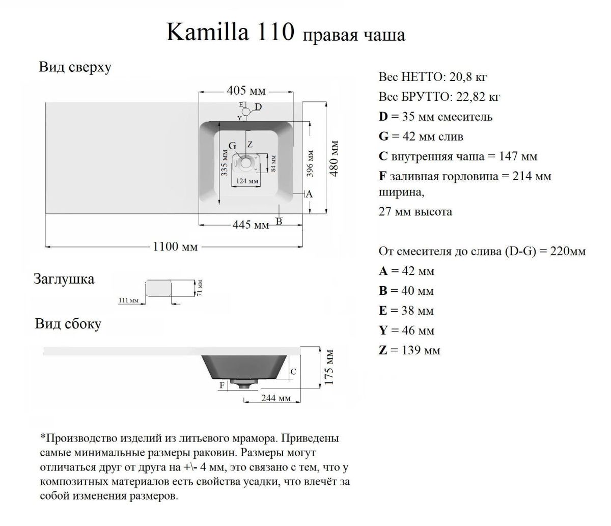 Раковина Камилла 110 (Madera) специально предназначена для тумбы ВИЛАР-50 ТМ Grossman. Чаша распологается с правой стороны от стиральной машины. Изготовлена из литьевого мрамора, отверстие под смеситель находится по центру чаши. В комплект к раковине входит: кронштейн и декоративная крышка из искуственного камня. Чаша обработана декоративным защитным покрытием, устойчивым к загрязнениям и механическим повреждениям.Устойчива к агрессивным химическим веществам. Выполнена в лаконичном стиле, впишется в современный интерьер. Подходит к стиральной машине глубиной до 470 мм, шириной до 600 мм и высотой до 850 мм.