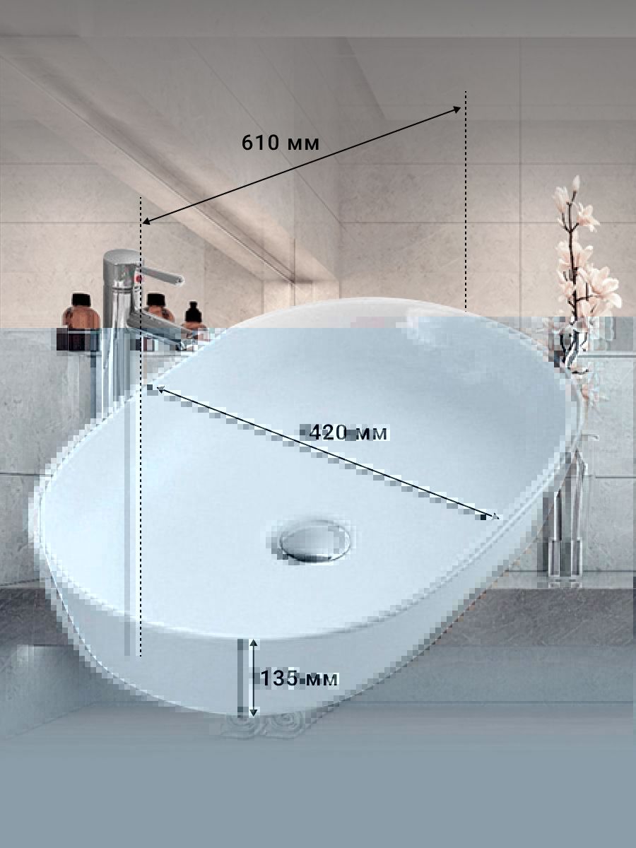 Размеры 610x420x135 мм делают ее универсальной для большинства ванных комнат, а стильный белый цвет добавит свежести и легкости вашему интерьеру. Этот умывальник идеально подходит для установки на мебель в ванной комнате, создавая современный и элегантный вид.