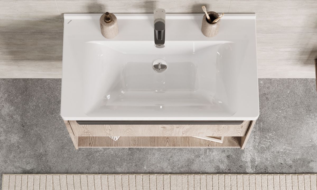 Прямоугольная раковина "Миранда-80" с широкой чашей удобен тем, что позволяет практично использовать пространство помещения и может гармонировать фактически со всеми стилями. Пристенный бортик выполняет не только декоративную функцию, но и препятствует попаданию мусора и влаги в пространство между стеной и раковиной.