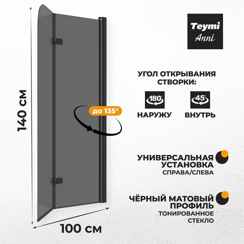 -- Наименование изделия: Шторка на ванну Teymi Anni S 100х140, тонированное закаленное стекло, профиль черный матовый; -- Артикул производителя: T00281; -- Коллекция: Anni; -- Ширина: 100 см; -- Высота: 140 см; -- Тип изделия: душевая шторка складная с открывающейся створкой; -- Установка: на борт ванны слева / справа; -- Конструкция: полу-распашная; -- Ход открывания створки: наружу 180 градусов, внутрь 45 градусов; -- Ход открывания пристенной части шторки: до 135 градусов; -- Направление открывания: наружу / внутрь; -- Антикапля / Стекло с водоотталкивающим защитным покрытием: да; -- Цвет стекла: тонированное; -- Цвет профиля: черный матовый; -- Материал профиля: алюминий; -- Толщина стекла: 6 мм; -- Тип стекла: закалённое травмобезопасное стекло; -- Полный монтажный комплект крепежа в наличии: да; -- Подробная схема сборки в наличии: да; -- Страна происхождения бренда: Финляндия; -- Страна производства: Китай.   Душевая штора на ванну Teymi Anni T00281 изготовлена из травмобезопасного закаленного стекла толщиной 6 мм с водоотталкивающим защитным покрытием "антикапля". Изделие имеет 100% защиту от коррозии что гарантирует максимально длительный срок его эксплуатации.   Шторка на ванну Teymi Anni T00281 имеет тонированное стекло, профиль, окрашенный в черный матовый цвет, изготовленный из алюминия. Шторка имеет две створки: пристенную, которая крепится к стене, и распашную, дополненную двумя поворотными держателями, которые имеют радиус поворота 180 градусов наружу и 45 градусов внутрь. Пристенная часть шторки вставляется в вертикальный п-образный профиль, который крепится к стене при помощи саморезов, и фиксируется на профиле с помощью двух шурупов. Пристенная часть шторки является подвижной и имеет ход открывания до 135 градусов. Это позволяет складывать и открывать створку как наружу, так и внутрь, даже если вплотную к ванне находится раковина, тумба или иной предмет интерьера. Такая конструкция делает использование шторки очень комфортным. Размеры изделия 100 х 140 см.   Комплектация: - Стекло закаленное 500х1400 мм, толщина стекла 6 мм. - Стекло закаленное 500х1400 мм с закругленным углом, толщина стекла 6 мм. - Профиль алюминиевый. - 2 поворотных держателя. - 2 декоративные заглушки. - Уплотнители силиконовые. - Комплект для крепежа (саморезы, дюбеля). - Паспорт изделия.