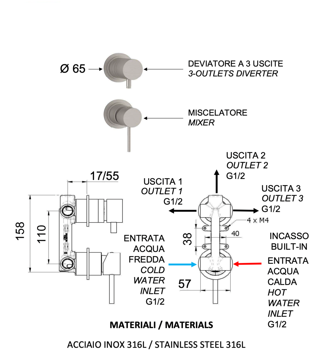 —Смеситель для душа Remer X Style Inox SSX93P встраиваемый в стену нержавеющая сталь