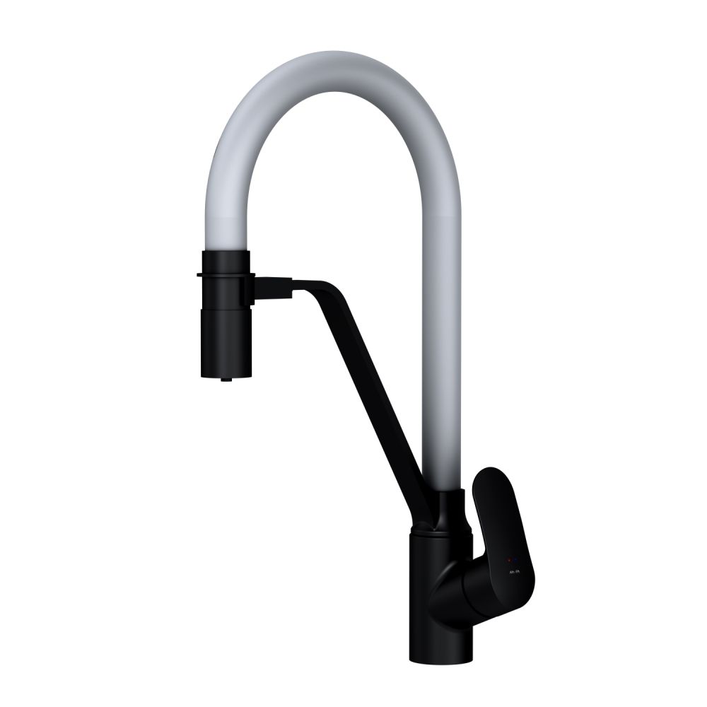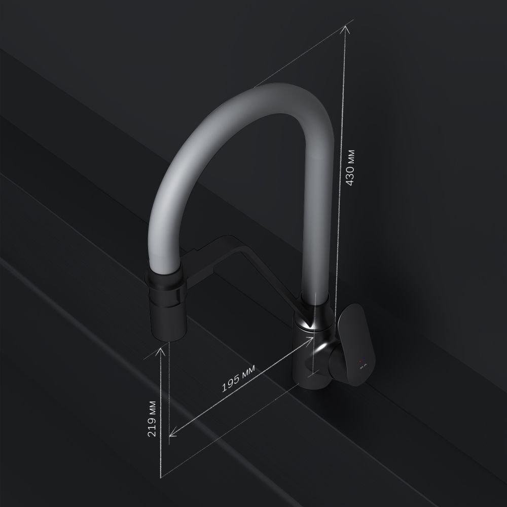 Трендовое сочетание цветов - матовый черный корпус смесителя и серый цвет излива идеально впишется в любой современный интерьер кухни.