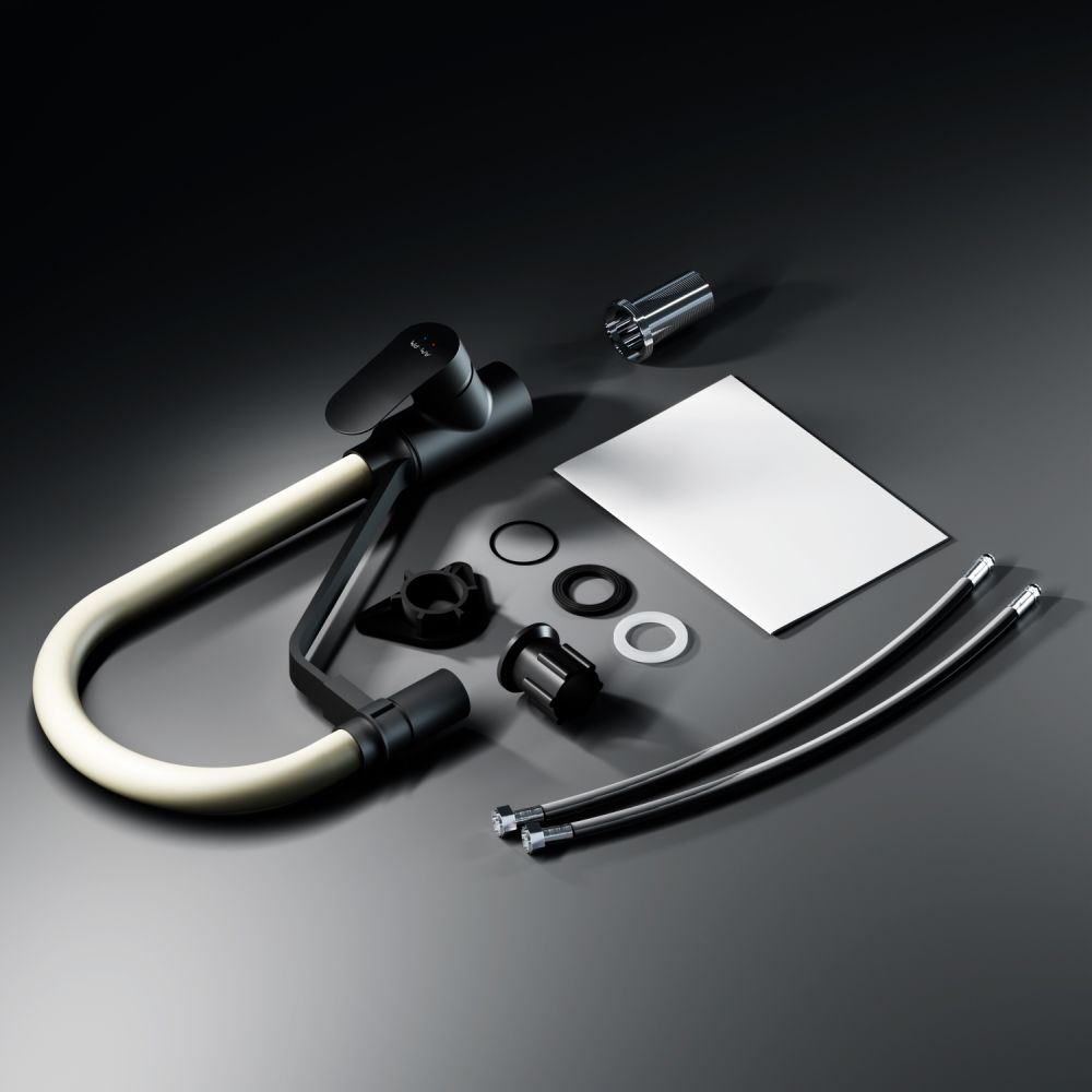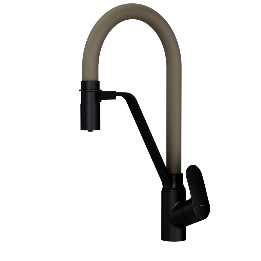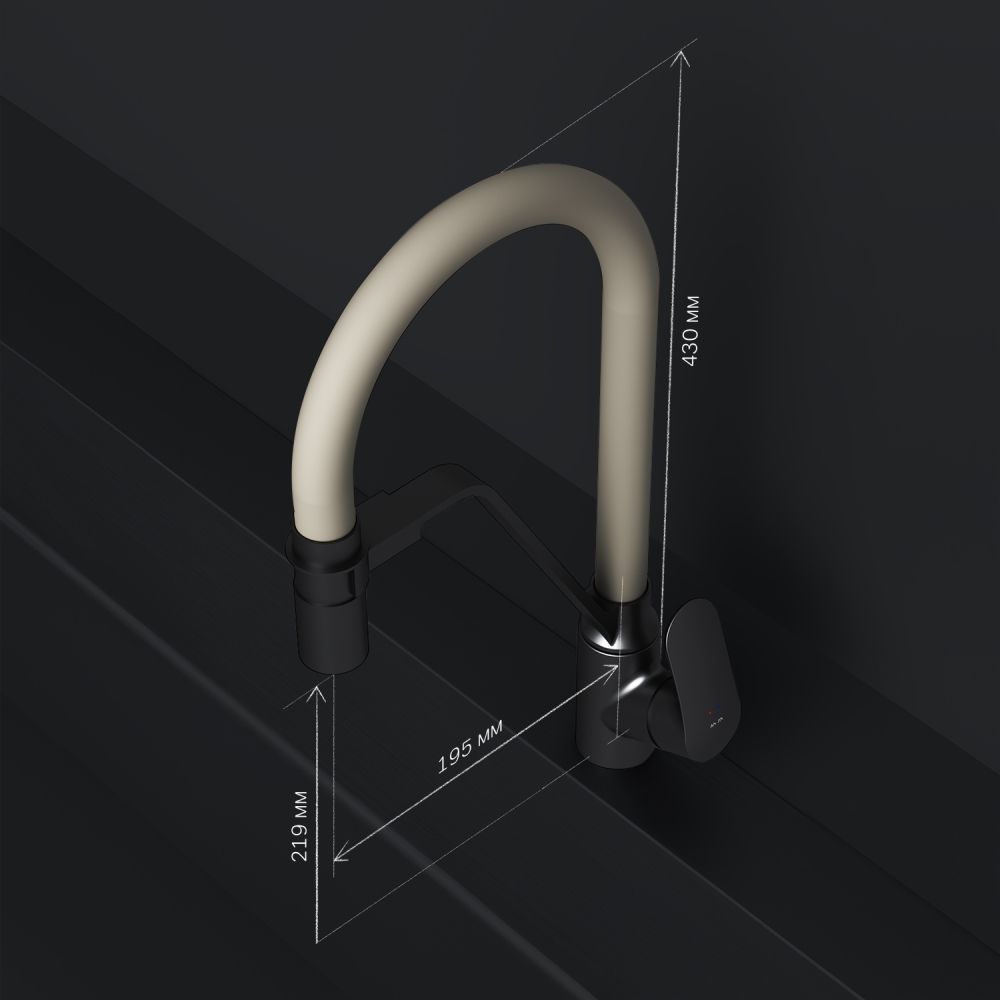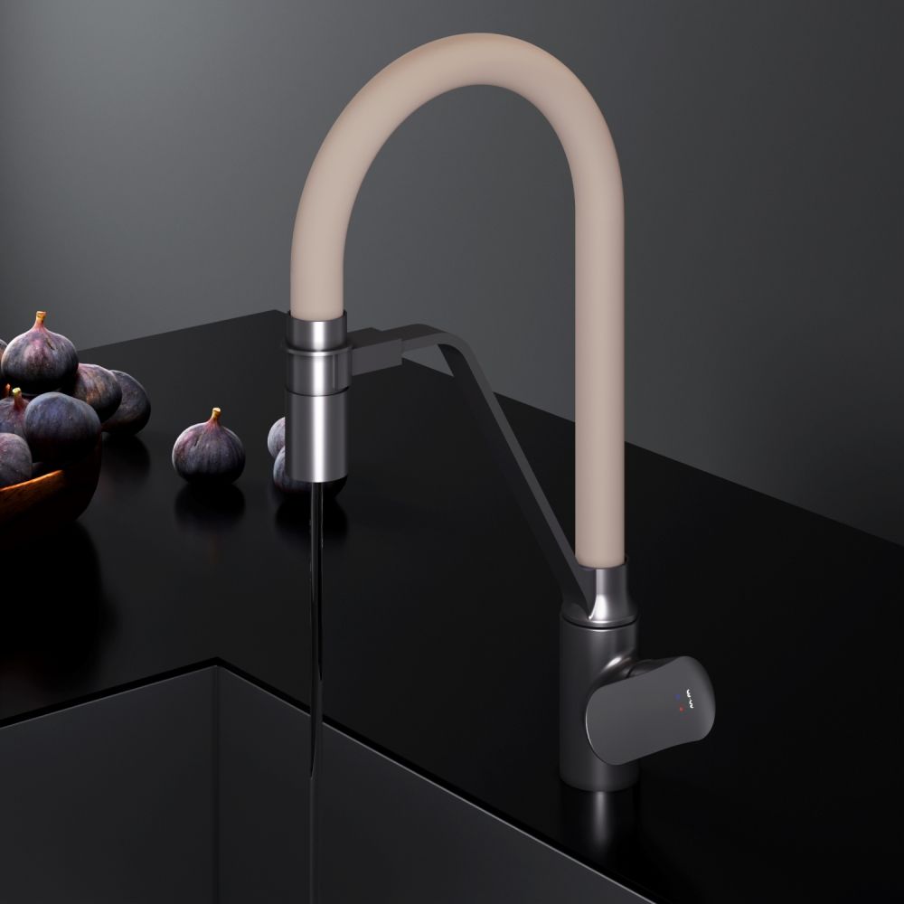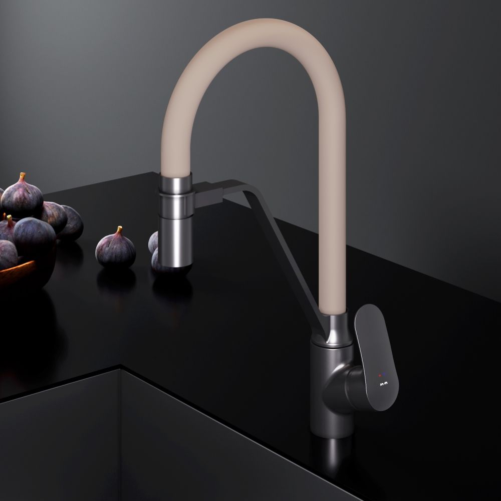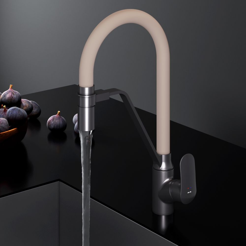 Трендовое сочетание цветов - матовый черный корпус смесителя и бежевый цвет излива идеально впишется в любой современный интерьер кухни.