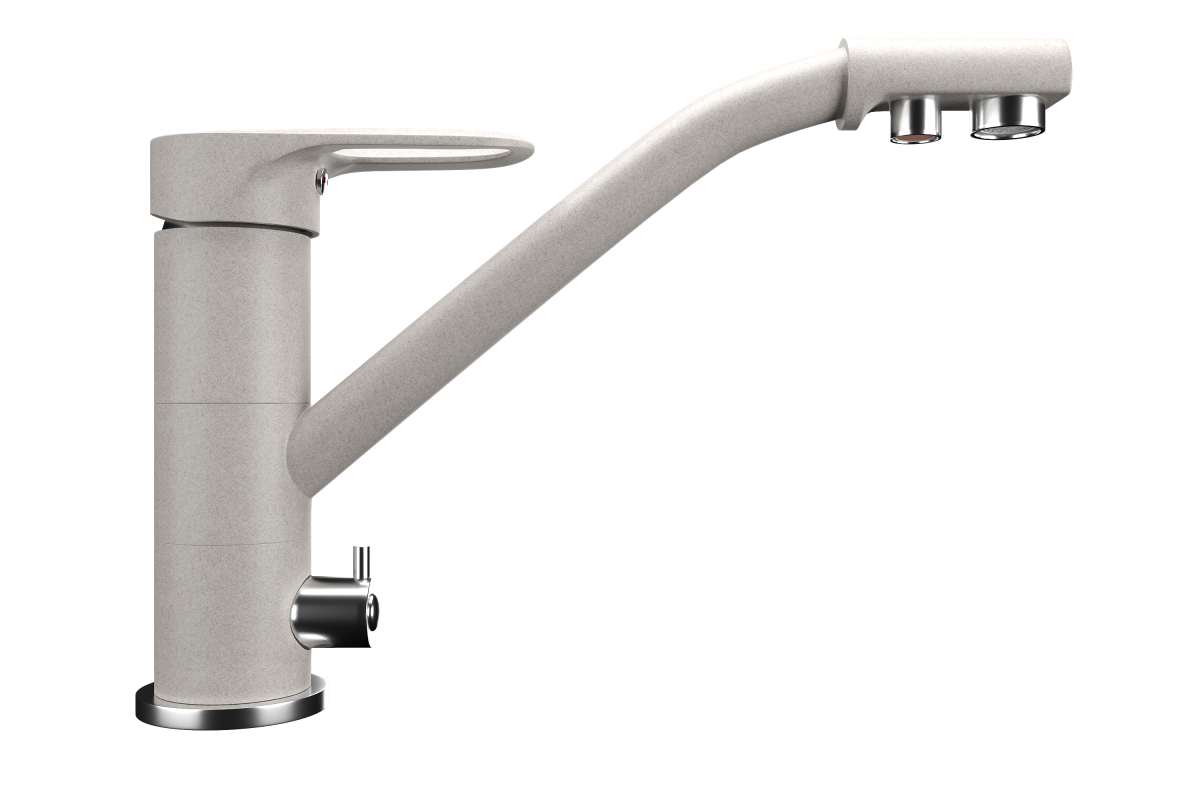 ULGRAN Quartz UQ-010 - высокоэргономичный кухонный смеситель с дополнительным краном для подключения фильтрованной воды, оснащенный кран-буксой с керамическими пластинами. Реализован тройной подвод воды через один излив: холодная, горячая и фильтрованная. Переход с одного подвода на другой производится поворотом рычага. Набор для соединения с фильтром входит в комплект . Система фильтрации приобретается дополнительно и монтируется под мойку, специальный индикатор сообщает о необходимости замены картриджа. Материал корпуса выполнен из высококачественной латуни, а окрашивание под "искусственный камень" в цвет мойки ULGRAN Quartz выполняется на собственном производстве, что позволяет идеально попасть в фирменный цвет ULGRAN Quart. В качестве керамического картриджа используется известный бренд Wanhai диаметром 35 мм с высокой пропускной способностью в 500 тысяч циклов "открывания-закрывания".  На подвижные части картриджа  Wanhai  нанесена специальная невымываемая силиконовая смазка, а керамические пластины изготовлены из 96% оксида алюминия, что, в сочетании с высоким качеством шлифовки обеспечивает долговечность, надежность, плавность хода рукоятки.  Смеситель оборудован съемным пластиковым аэратором для экономии воды  и поворотным изливом на 360 градусов. В комплектацию входя:  керамический картридж  Wanhai, гибкая подводка, комплект крепежных элементов,  кран-букса с керамическими пластинами для дополнительного излива для фильтрованной воды, набор для подсоединения фильтра питьевой воды (гибкая подводка + переходник-цанга), технический паспорт и гарантийный талон. Заводская гарантия составляет 3 года на материал корпуса, 1 год на комплектующие к смесителю и 1 год на материал покрытия.
