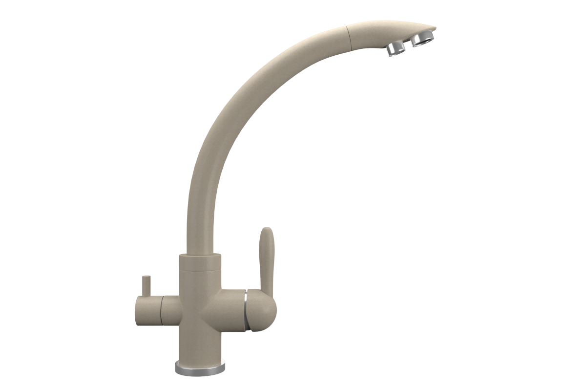 ULGRAN Quartz UQ-017 - современный кухонный смеситель с дополнительным краном для подключения фильтрованной воды, оснащенный кран-буксой с керамическими пластинами. Реализован тройной подвод воды через один излив: холодная, горячая и фильтрованная. Переход с одного подвода на другой производится поворотом рычага. Набор для соединения с фильтром входит в комплект . Система фильтрации приобретается дополнительно и монтируется под мойку, специальный индикатор сообщает о необходимости замены картриджа. Материал корпуса выполнен из высококачественной латуни, а окрашивание под "искусственный камень" в цвет мойки ULGRAN Quartz выполняется на собственном производстве, что позволяет идеально попасть в фирменный цветULGRAN Quartz. В качестве керамического картриджа используется известный бренд Wanhai диаметром 35 мм с высокой пропускной способностью в 500 тысяч циклов "открывания-закрывания".  На подвижные части картриджа  Wanhai  нанесена специальная невымываемая силиконовая смазка, а керамические пластины изготовлены из 96% оксида алюминия, что, в сочетании с высоким качеством шлифовки обеспечивает долговечность, надежность, плавность хода рукоятки.  Смеситель оборудован съемным пластиковым аэратором для экономии воды  и поворотным изливом на 360 градусов. В комплектацию входя:  керамический картридж  Wanhai, гибкая подводка, комплект крепежных элементов,  кран-букса с керамическими пластинами для дополнительного излива для фильтрованной воды, набор для подсоединения фильтра питьевой воды (гибкая подводка + переходник-цанга), технический паспорт и гарантийный талон. Заводская гарантия составляет 3 года на материал корпуса, 1 год на комплектующие к смесителю и 1 год на материал покрытия.