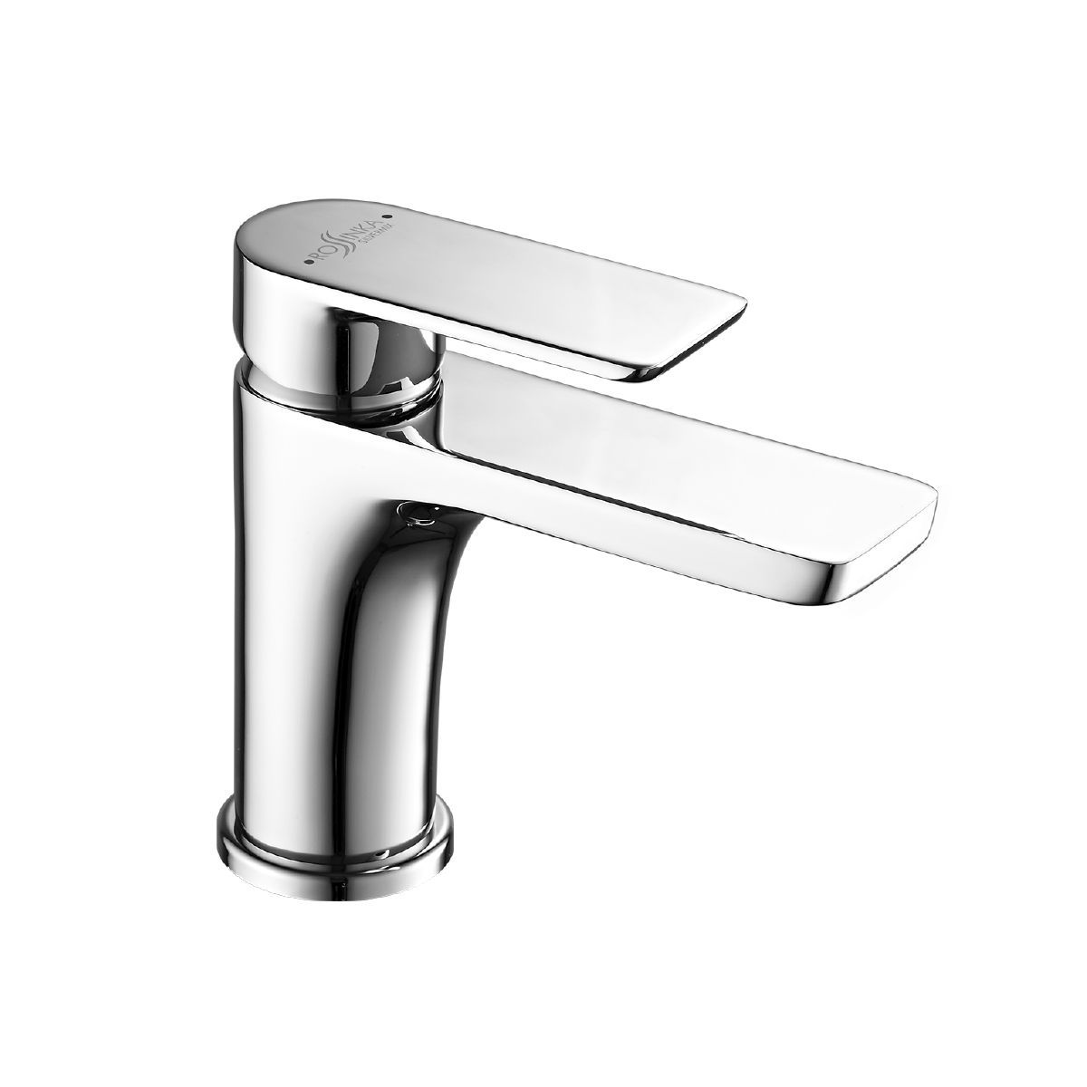 Смеситель термостатический для умывальника монолитный, округлой формы. Корпус латунный, тип однорычажный, горизонтальный способ монтажа, гипкий тип подводки.