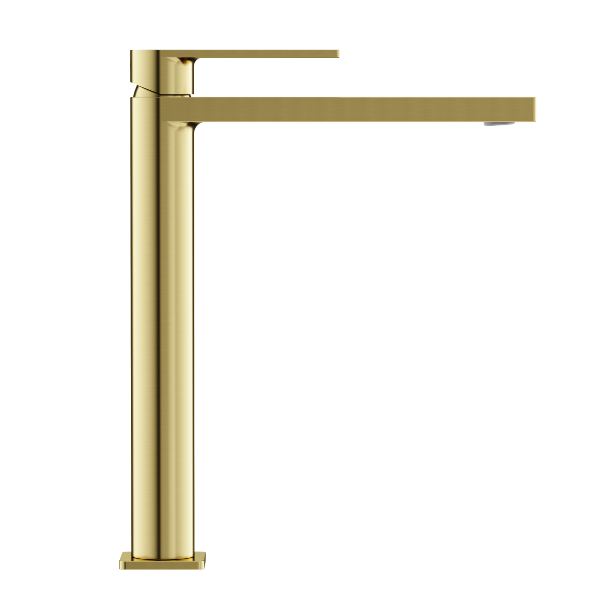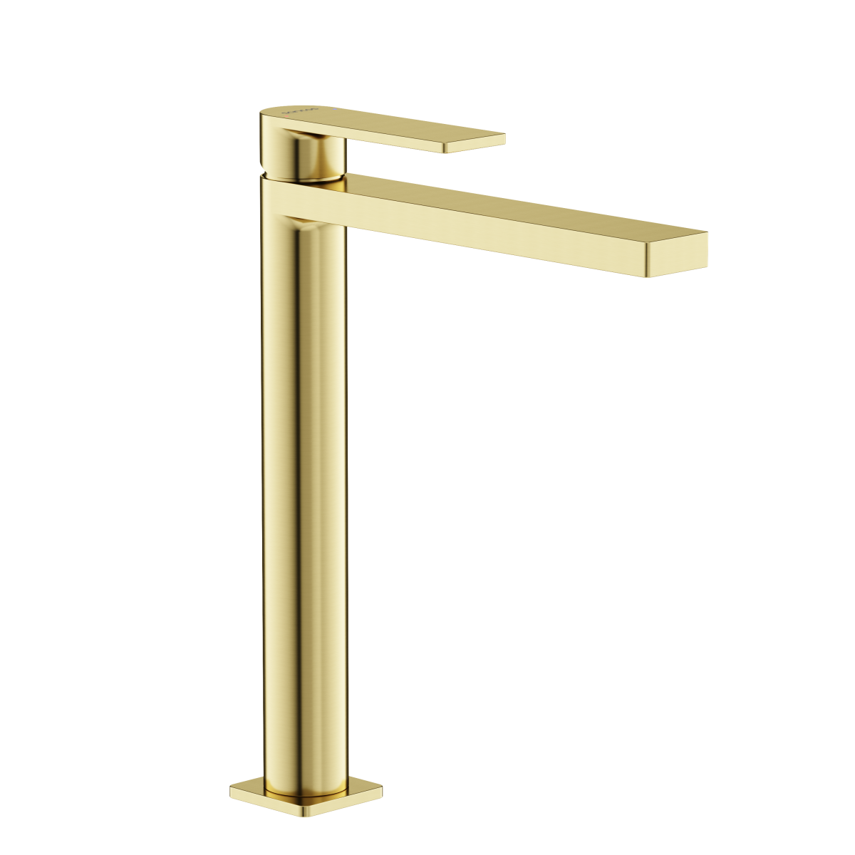 Смеситель для раковины высокий однорычажный; Надёжный корпус из прочной латуни; Точная  регулировка температуры и напора воды с используемыми картриджами  SEDAL (Испания);  мягкий поток воды без разбрызгивания  за счёт силиконовых аэраторов Neoperl®; Экстра прочное покрытие методом PVD; Гибкая подводка в оплетке из нержавеющей стали, с  увеличенной длиной - 600 мм; цвет брашированное золото
