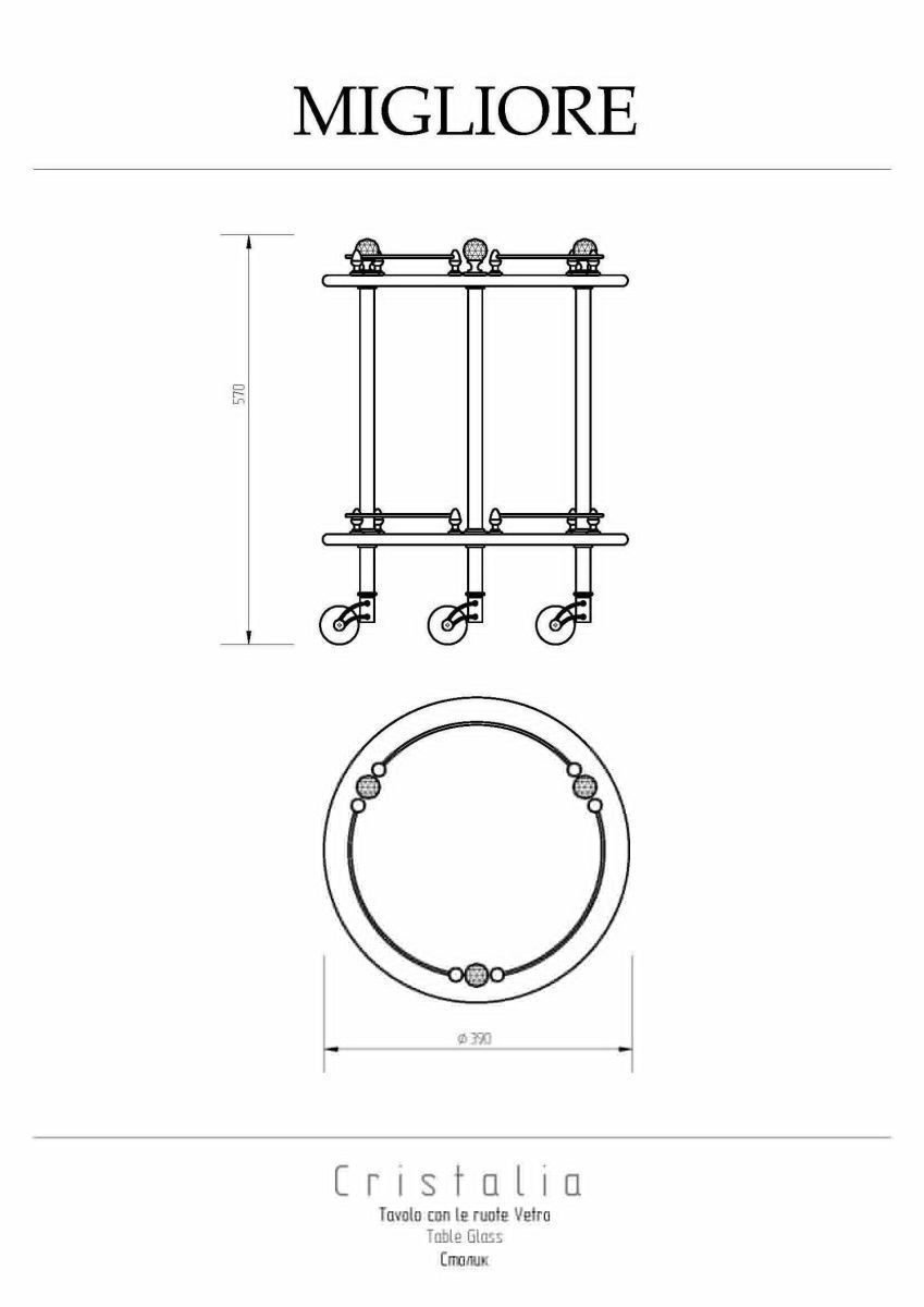 Столик коллекции CRISTALIA бренда MIGLIORE - это красивый и многофункциональный аксессуар, который станет достойным украшением вашего интерьера. Столик на колесах, две круглые полочки выполнены из высококачественного стекла с изящным латунным обрамлением по периметру. Стекло изготовлено вручную с добавлением фольги из серебра, которая, растворяясь в стекле, образует красивый декор. Аксессуар богато украшен кристаллами Сваровски.